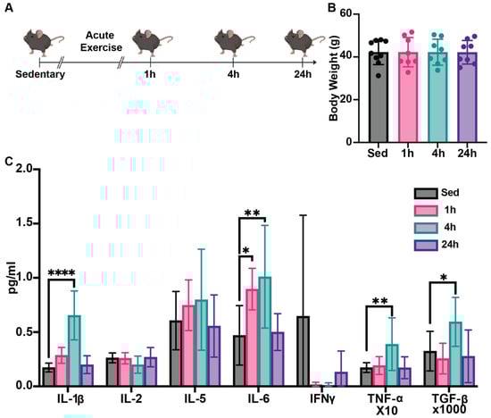 The experimental design is illustrated in Figure 1A, and the body weight was measured before sacrifice (Figure 1B). To understand systemic impacts of HIIE, we first assessed a broad spectrum of pro-inflammatory and anti-inflammatory cytokine profiles, including IL 1β, IL 2, IL-5, IL-6, interferon-gamma (IFN-γ), TGF-β, and TNF-α. We found that serum IL 1β, TGF β, and TNF α levels in the 4-h post-HIIE group were significantly increased compared to the sedentary group, but this increase returned to baseline 24 h post-HIIE (Figure 1C). Moreover, significant increases in the serum levels of IL-6 were observed in the 1- and 4-h groups compared to the sedentary group, which also returned to baseline 24 h post-HIIE.