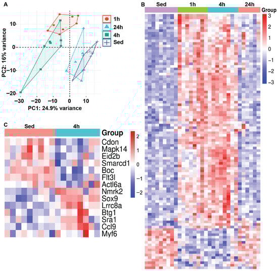 We next examined changes in muscle mRNA gene expression in response to HIIE. Principal component analysis (PCA) was performed to assess variability in gene expression across groups, displaying relationships among samples based on their expression profiles. Using PCA, we identified clear clusters that separated sedentary groups from those measured at 1 and 4 h after HIIE, which appear to resolve by 24 h (Figure 2A). Next, heat map analysis illustrates the 100 most significantly up- or down-regulated genes in sedentary and post-acute exercise mice, showing log2-fold changes in gene expression values across each sample (Figure 2B). The red-to-blue color scale represents the intensity of fold changes for each gene, with red indicating an increase in expression and blue indicating a decrease. Each row represents an individual gene, while each column shows the groupings of sedentary and HIIE. Interestingly, fourteen genes associated with myoblast differentiation were differentially expressed (Lrrc8a, Nmrk2, Sox9, Btg1, Sra1, Ccl9, Myf6, Boc, Flt3l, Cdon, Mapk14, Eid2b, Actl6a, and Smarcd1) 4 h after HIIE when compared to muscle from sedentary mice (Figure 2C & Supplementary Figure S1). In contrast, there were no significant changes in the expression of genes associated with myoblast differentiation at 1 and 24 h compared with muscles from sedentary mice (Supplementary Figure S2).