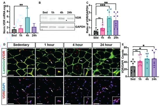 Real-time reverse transcription–polymerase chain reaction (RT-PCR) analysis confirmed a significant increase in VDR expression in skeletal muscle tissue at 4 h post-HIIE (3.4 ± 1.1-fold) compared to the sedentary group (set as 1.0-fold), indicating a transcriptional response to acute exercise (Figure 3A). Western blot analysis also showed a substantial rise in VDR protein levels at 4 h post-HIIE; however, the levels of VDR protein remained elevated at 24 h (Figure 3B,C). We note, however, that high Ct values were observed during qPCR, and Western blotting required long exposure times, suggesting VDR content in muscle was on the threshold of detection. Immunohistochemical analysis was then used to identify where VDR is located within skeletal muscle fibers. In sedentary mice (Figure 3D), VDR expression (red) was mainly observed at the periphery of muscle fibers, shown with laminin. However, following HIIE, a prominent increase in the overall presence of VDR and nuclear localization (DAPI, blue) was apparent at 4 h post-exercise, and remained elevated at 24 h (Figure 3E).