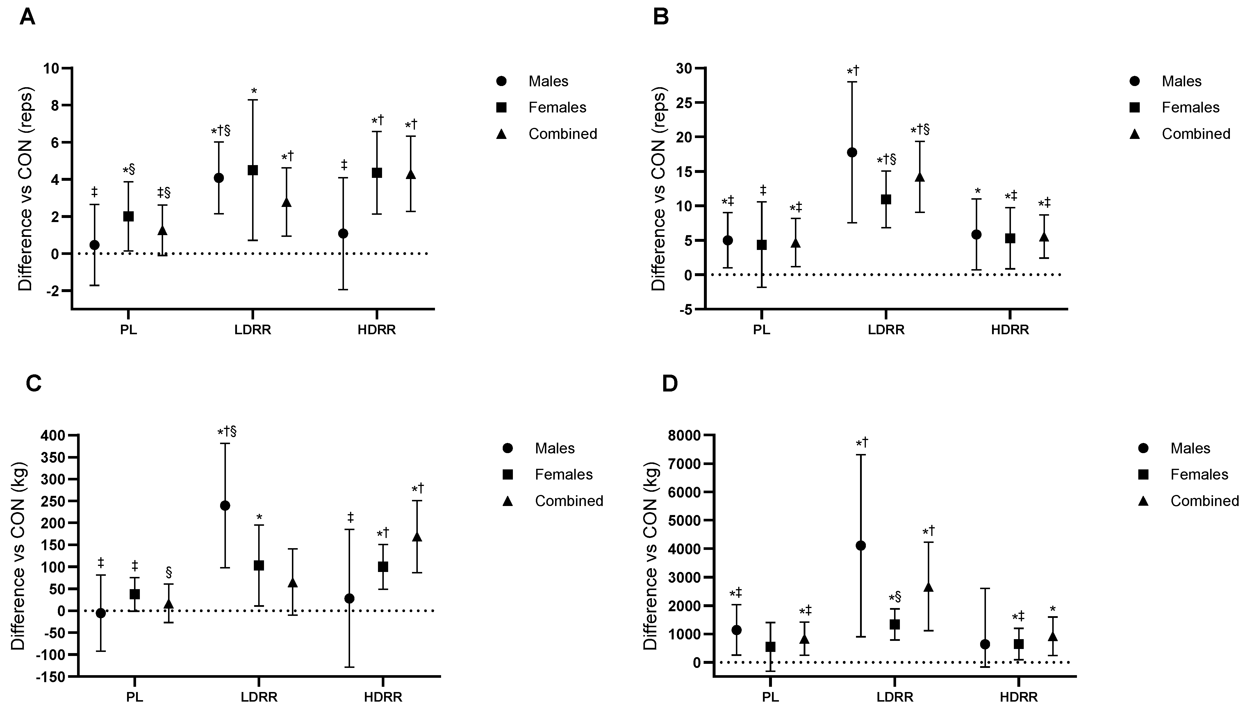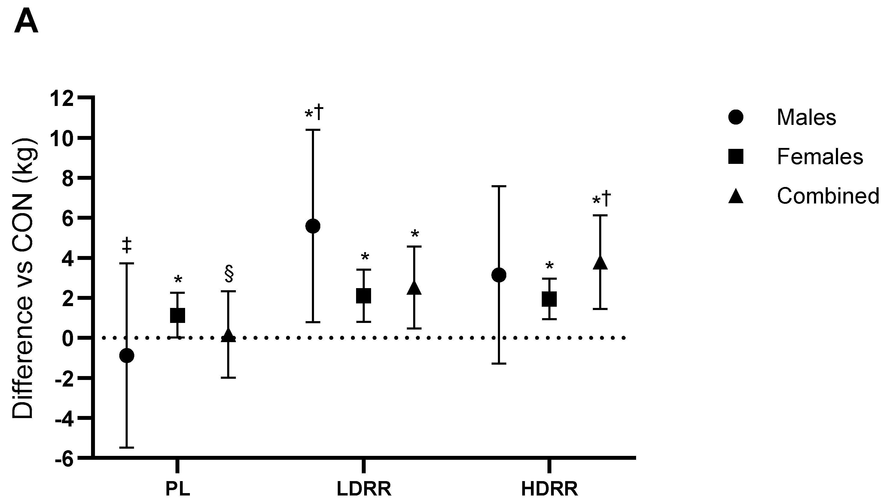 | Leg press 1RM (kg) | 290.3 ± 117.6 | 391.2 ± 83.5 | 196.5 ± 39.9 † | 0.01 |