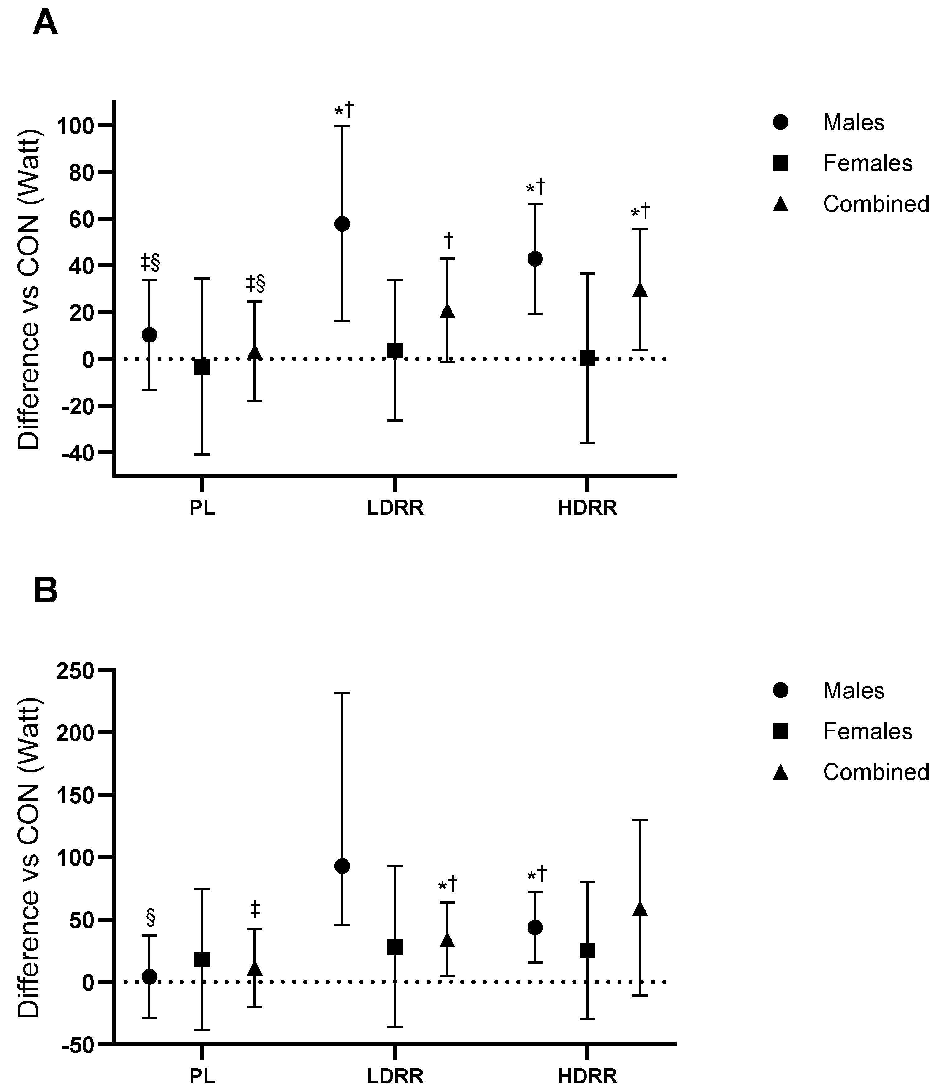 | Peak Power (W) | CON | 851.4 ± 138.7 | 536.9 ± 120.8 | 694.1 ± 24.9 | Trt | 0.54 |
