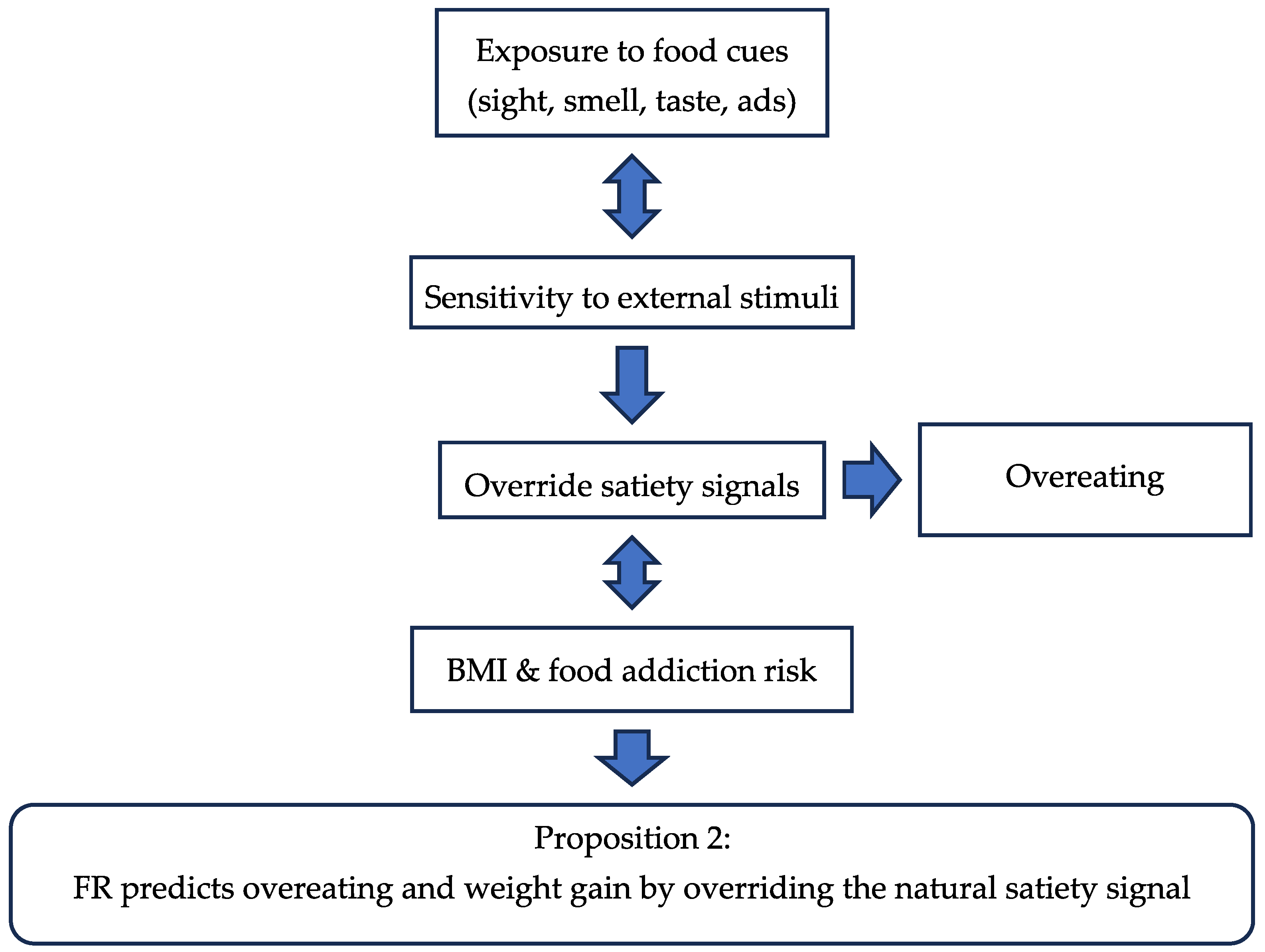 | Hunger (H) | FR, EOE, EF | Positively linked—hunger increases food responsiveness, emotional overeating, and enjoyment of food |