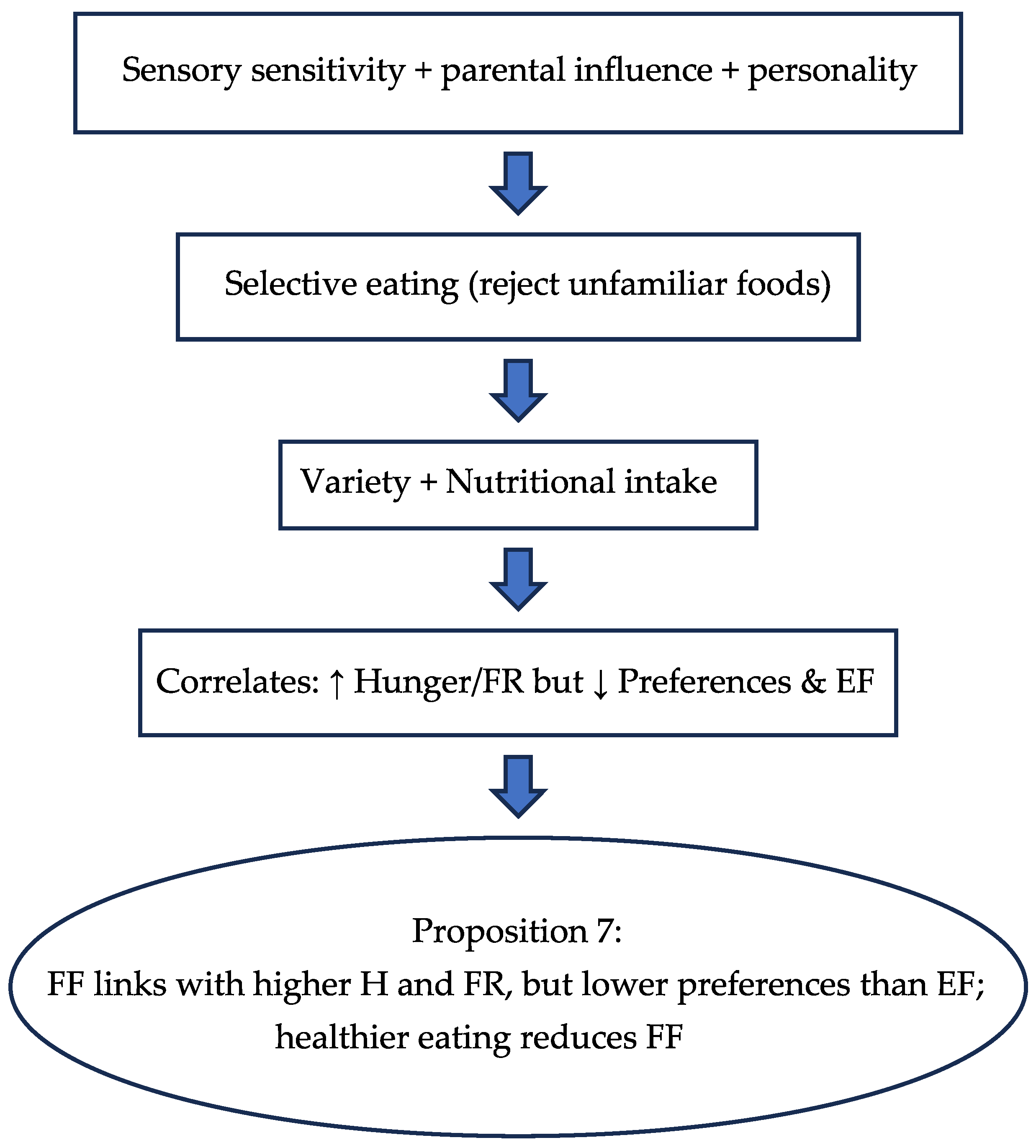 | EF | Inversely linked—fussiness reduces food enjoyment | |