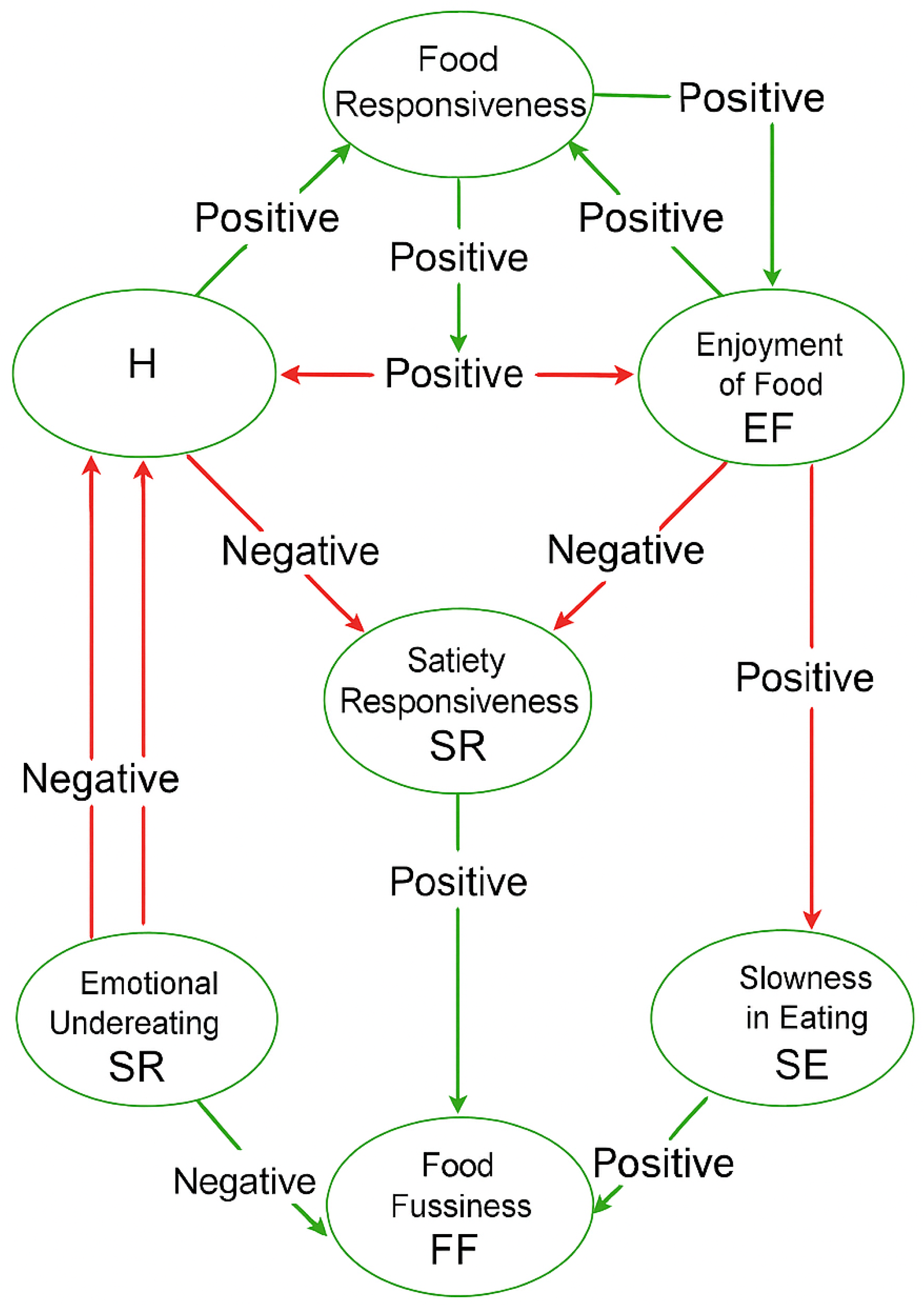 | Enjoyment of Food (EF) | H, FR | Positively linked—enjoyment increases with hunger and responsiveness |