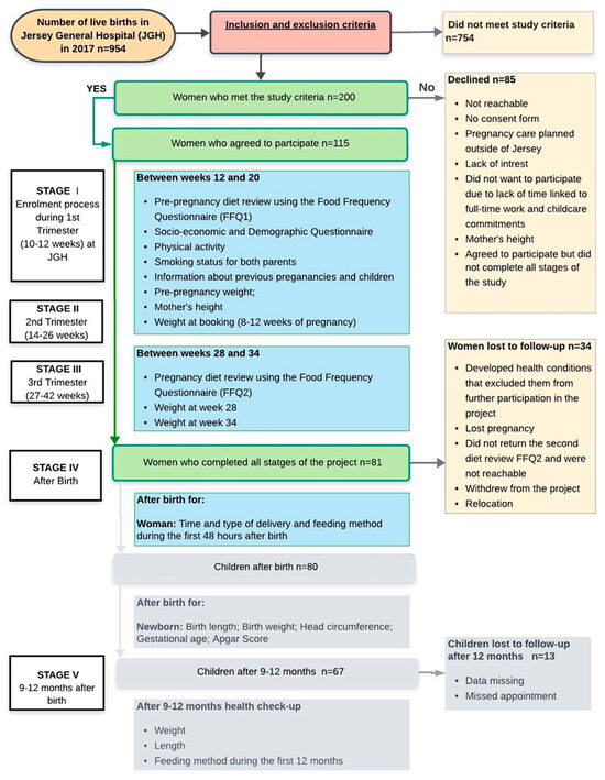 The study population consisted of pregnant women who attended the Maternity Unit at Jersey General Hospital (JGH) in Jersey, the Channel Islands. The women were from various ethnic backgrounds: native-born Jersey, British, Polish, and Portuguese/Madeiran nationals. This prospective observational study was conducted over three years, between September 2016 and September 2019, accordingly to the study timeline (Figure 1). Women enrolled in this study were identified after their first appointment between the 10th and 12th weeks of pregnancy. The inclusion criteria of the study were an uncomplicated (healthy) and singleton pregnancy without gynaecological diseases; gestation before the 20th week; and ethnicity of Jersey, British, Irish, Polish, or Portuguese. Women who self-identified as Jersey or British were combined into a single “native/UK” group, reflecting the two largest ethnic categories in the source population. Other European nationalities were classified as “European migrants”. Because the individual migrant subgroups were numerically small, analyses by specific nationality were not feasible. Among European migrants, duration of residence in Jersey was categorised as <10 years and ≥10 years to capture differences in acculturation and exposure to the local health and food environment. The exclusion criteria of the study were any pathology known to alter food intake during pregnancy such as diabetes, heart disease, kidney disease, hypertension, or depression; a specific clinical issue (mental health, HIV infection, or Hepatitis B); an impairment that would limit communication during an interview, limit the patient’s legal actions, or limit their ability to provide full consent; unwillingness to participate in all stages of the research; unwillingness to have anthropometric measurements taken and used as data for the study. Therefore, women who had high-risk pregnancies were automatically excluded, which is particularly important to mention because Jersey has a population slightly greater than 103,000 [50] with only 954 live births in 2017 (in the year of recruitment) and a birth rate continuing to decline [47].