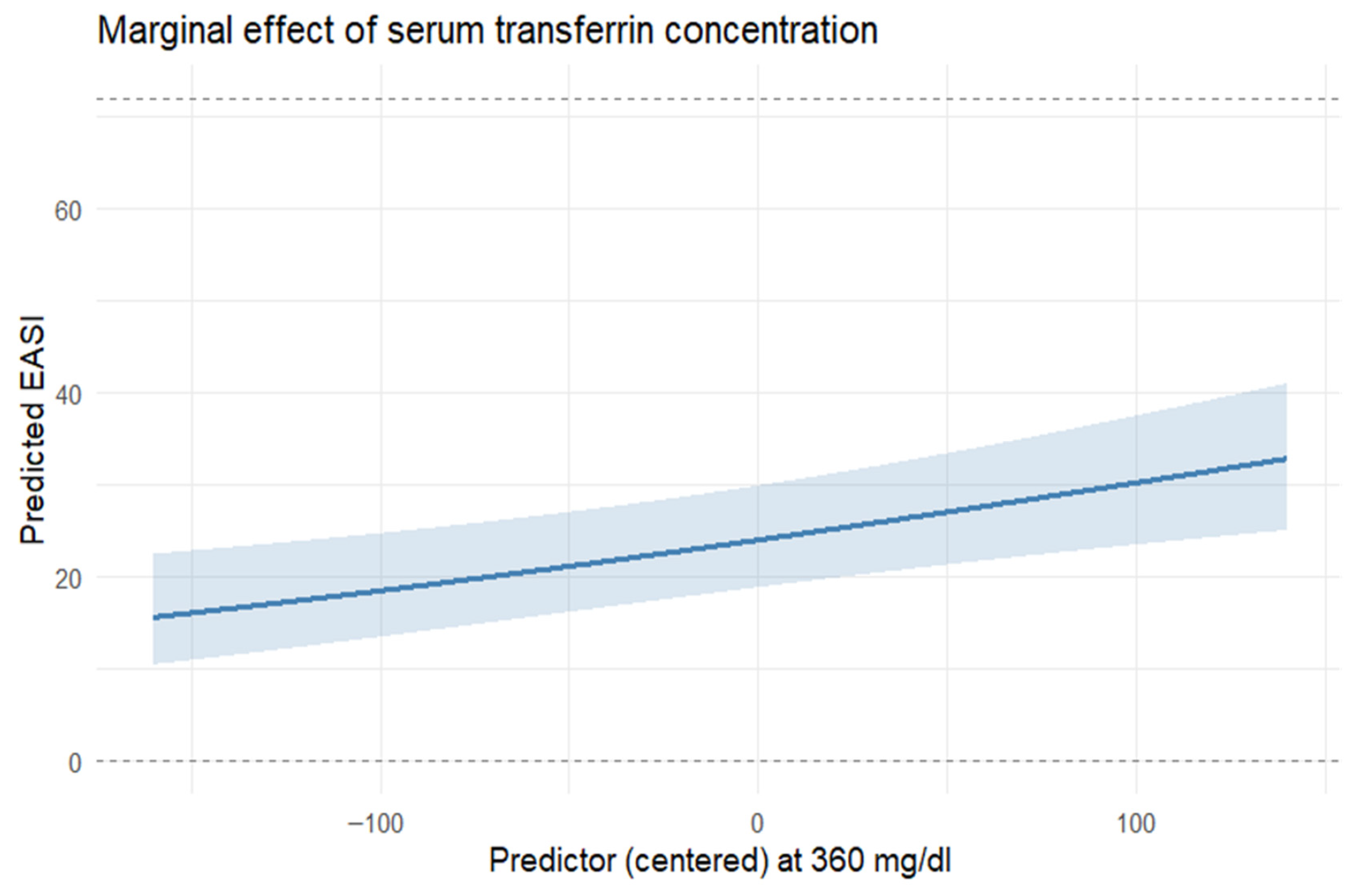 Several limitations should be acknowledged. This was a single-center study with a moderate sample size, which may limit generalizability. The absence of a healthy control group precludes direct comparison with normal iron homeostasis. Furthermore, the cross-sectional design prevents causal inference about the relationships between iron status and AD severity or quality of life. In addition, residual confounding by unmeasured nutritional, metabolic, or hormonal factors cannot be entirely excluded. Lastly, we did not assess the impact of systemic or biologic therapies on iron metabolism, which may be relevant for future research. An additional methodological limitation is that we did not formally test interactions between inflammatory activity (hsCRP or IL-6) and iron biomarkers. Although biologically plausible, such models were statistically infeasible in this dataset: each beta-regression model already included 7–8 continuous predictors plus prespecified covariates, resulting in 9–10 parameters for only 86 complete cases. Introducing interaction terms would have substantially inflated model dimensionality and produced non-identifiable or unstable estimates—consistent with the coefficient variability already observed in our 500-iteration bootstrap. For this reason, our inference focuses on main-effect associations, and we avoid over-interpreting potential effect modification by inflammatory status.
