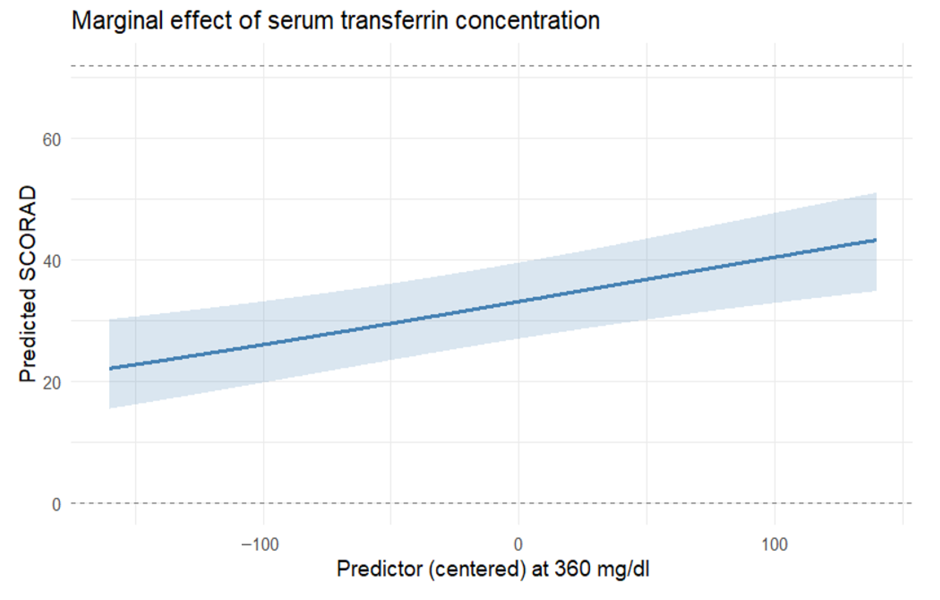 Given the sample size relative to the number of candidate predictors, we did not include interaction terms (e.g., hsCRP × iron biomarkers) in the models, as such specifications would be statistically underpowered and likely unstable. The primary aim of the modelling was inference rather than development of a standalone prediction tool; accordingly, we did not compute optimism-corrected global performance measures. Cross-validated penalization was used solely as a dimensionality-reduction step to stabilize multivariable estimates. Regression coefficients (β) and their standard errors are reported with three significant figures to ensure comparability across predictors measured on heterogeneous scales (e.g., IgE, serum iron, transferrin). Predicted values and marginal changes (Δ outcome) are shown using four decimal places (.4f), reflecting the 0–1 scale of beta-regression predictions. For predictors whose effects are extremely small, three significant figures were retained instead of .4f to avoid presenting rounded zeros. These conventions were applied consistently across all model tables.