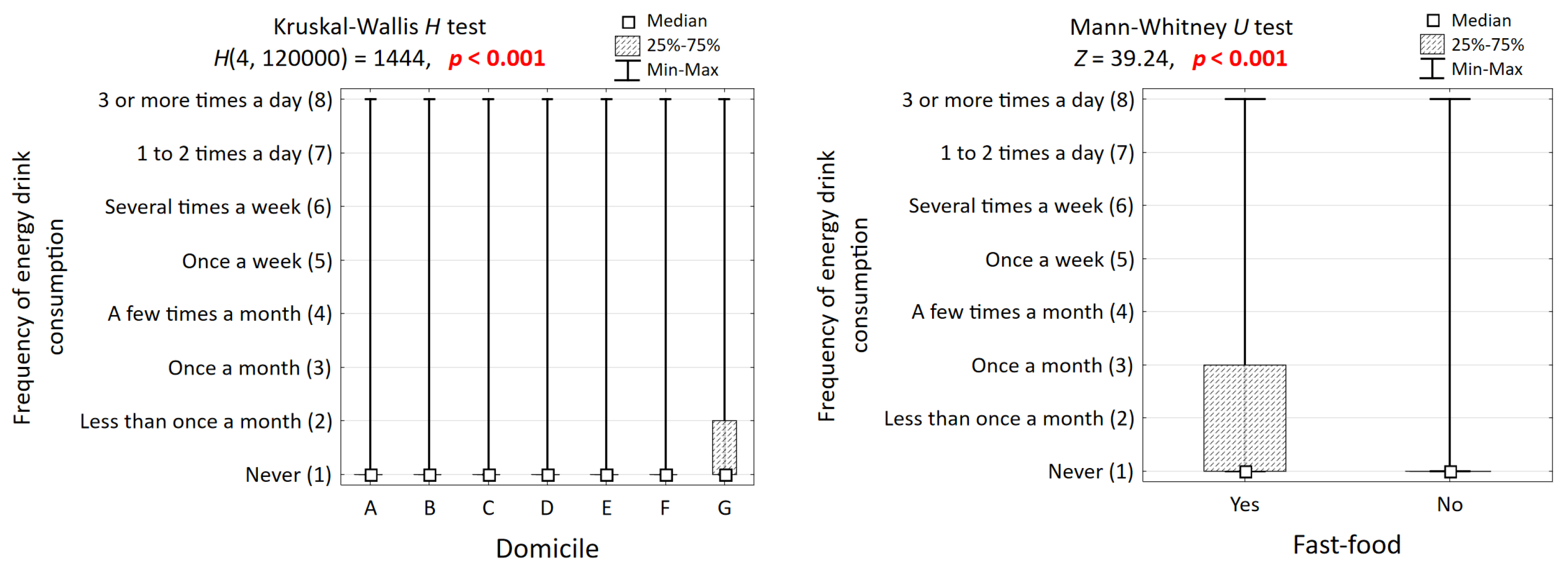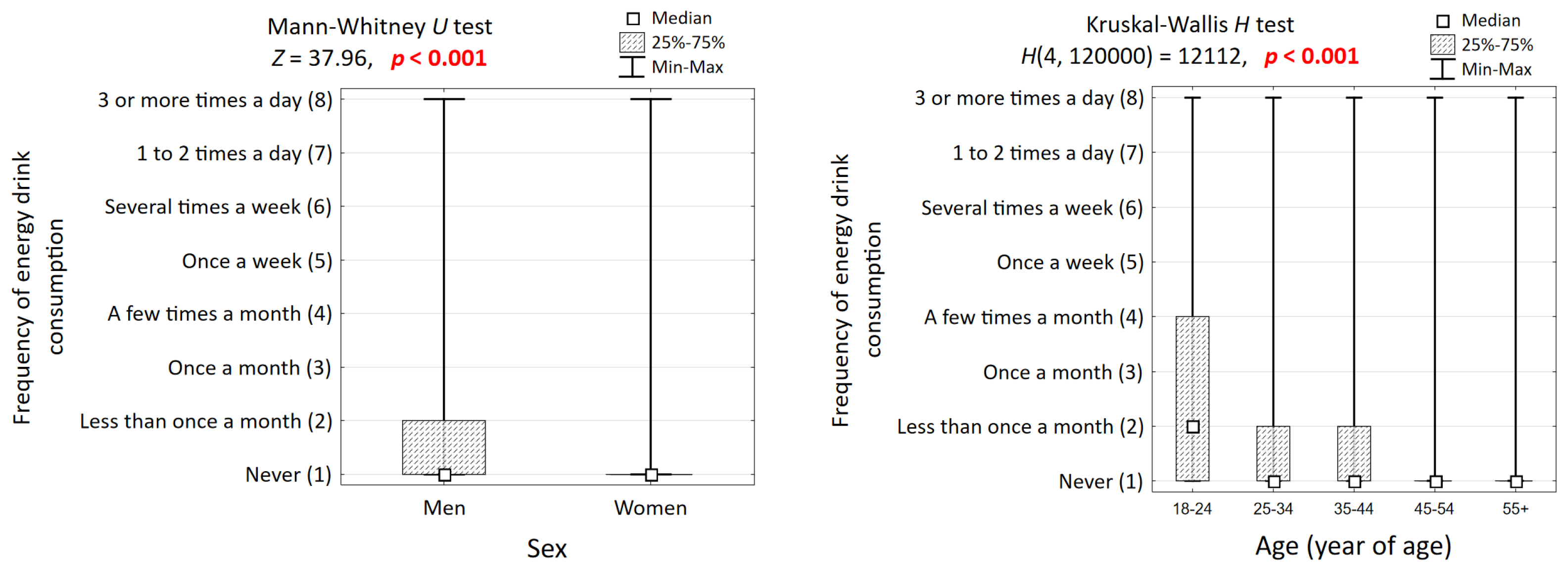 - Mularczyk-Tomczewska, P.; Lewandowska, A.; Kamińska, A.; Gałecka, M.; Atroszko, P.A.; Baran, T.; Koweszko, T.; Silczuk, A. Patterns of Energy Drink Use, Risk Perception, and Regulatory Attitudes in the Adult Polish Population: Results of a Cross-Sectional Survey. Nutrients 2025, 17, 1458. [Google Scholar] [CrossRef] [PubMed]