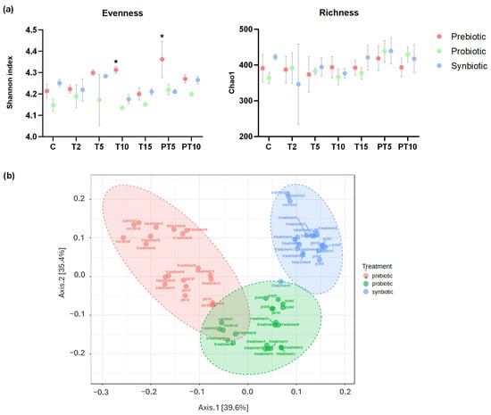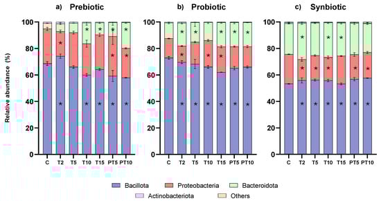In terms of microbial alpha diversity, only the supplementation with the prebiotic (β-glucan) achieved a significant increase as referred to the situation in the control period (Figure 2a). Concretely, supplying the prebiotic increased the evenness (how equal the community is numerically), with statistically different values (p < 0.05) of Shannon index after 10 days of treatment and (T10) (4.31) and at 5 days of post-treatment stage (4.36), compared to the control (4.21). In terms of richness (number of different phylotypes present in a community), the supplementation with the prebiotic led to no significant differences over the experiment time points. In terms of beta diversity (Figure 2b), the microbial communities of the different treatments showed statistically significant differences (F-value: 48.019; R-squared: 0.61548; p-value: 0.001), with prebiotic supplementation reflecting the greatest change in diversity, while treatment with the synbiotic generated a more consistent and prolonged effect over time. The variations in the microbiota are detailed in greater depth below, comparing relative abundances at the phylum and genus levels.