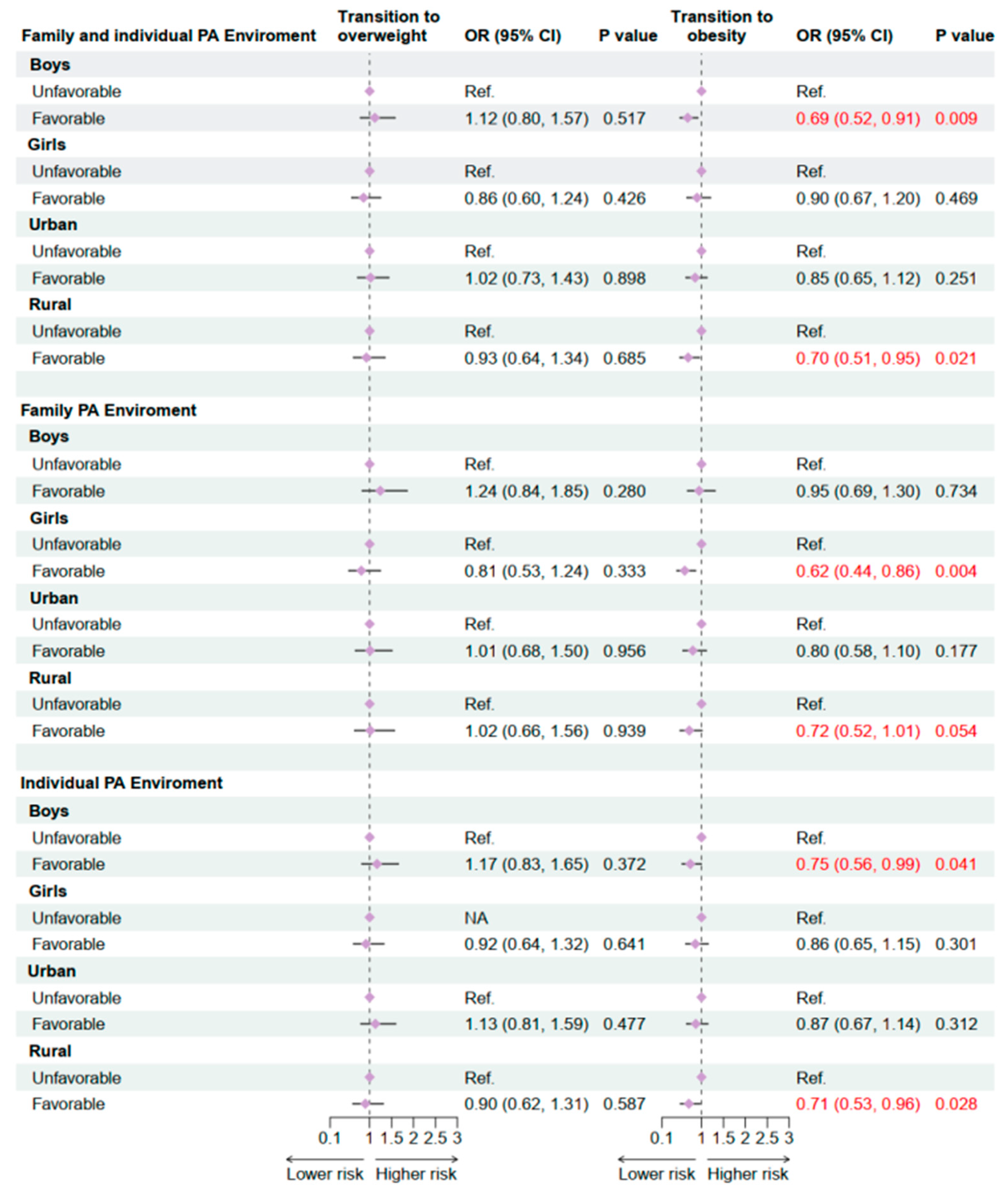 3.2. Subgroup Differences in the Association Between Family and Individual Physical Activity Environments and Obesity Transitions