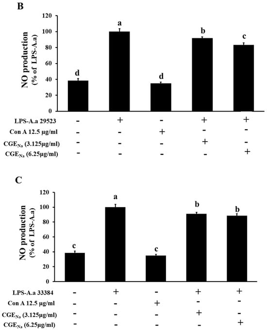 Inhibitory effects of CGENa on nitric oxide (NO) production induced by LPS-A.a. in RAW 264.7 macrophages (ATCC strains 29522; (A), 29523; (B), and 33384; (C)). Experimental conditions are shown in Figure 3. Cells were stimulated with 2 µg/mL LPS for 1 h and then treated with 3.125 or 6.25 µg/mL CGENa for 48 h. NO production in culture supernatants was quantified using Griess reagent. Data represent the mean ± SD (n = 3). Each superscript (a–d) indicates a statistically significant difference between treatment groups, as determined by one-way ANOVA followed by Tukey’s multiple comparison test (p < 0.05). +: Treatment, -: No treatment.