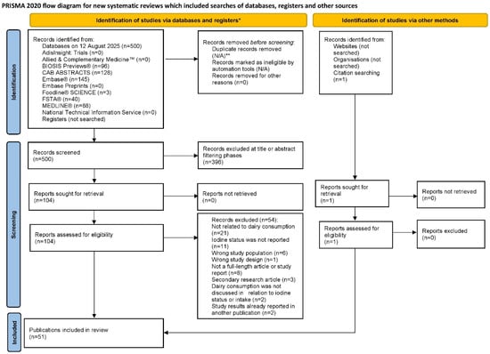 Ten literature databases (AdisInsight: Trials, Allied & Complementary Medicine™, BIOSIS Previews®, CAB ABSTRACTS, Embase®, Embase Preprints, Foodline®: SCIENCE, FSTA®, MEDLINE®, and NTIS: National Technical Information Service) were searched on 12 August 2024 and 5 March 2025 using the electronic search tool ProQuest Dialog™ (Version 75.0) (Clarivate, Philadelphia, PA, USA, 2022). Duplicates were automatically removed using ProQuest Dialog™ (Version 75.0). Keywords related to iodine, dairy, and pregnant or lactating populations were searched. For an article to be identified, the term “iodine” or “iodide” had to appear in the title, together with at least 1 term for the study population (e.g., “pregnant”). Additionally, at least 1 term for dairy (e.g., “milk”) had to appear either in the title or abstract of the article. No limitations were placed on the language of publication. The original search on 12 August 2024 had no limitations on the publication date, while the updated search on 5 March 2025 was limited to studies published on or after 12 August 2024. In addition to the studies identified through database searching, reference lists of recent systematic or narrative reviews were also screened to ensure the identification of all relevant studies. The date ranges and search strategy used to retrieve literature are further detailed in Supplementary Tables S1 and S2, respectively.