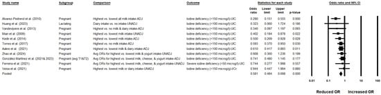In the study conducted among lactating women [], iodine deficiency was also assessed using BMIC values. Event rates indicated fewer cases among higher dairy consumers compared to lower dairy consumers corresponding to an OR of 0.29 (95% CI: 0.05, 1.50). This suggests lower odds of iodine deficiency with higher dairy intake, although the effect estimate was associated with wide CIs and was not statistically significant.
