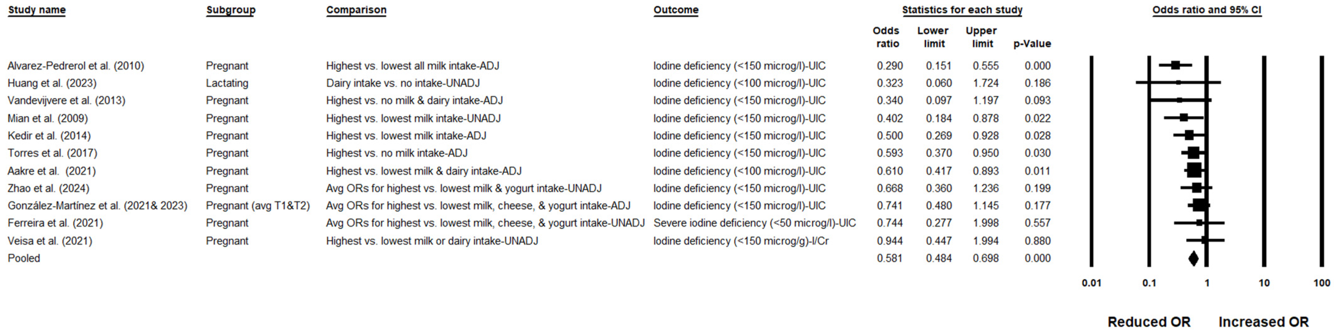 APA StyleRazmpoosh, E., Geronimo, K., Gauntlett, C., Vicente, I., Pham, P., Shah, A., & Musa-Veloso, K. (2025). Dairy Intake and Iodine Status in Pregnant and Lactating Women: A Systematic Review and Meta-Analysis. Nutrients, 17(23), 3765. https://doi.org/10.3390/nu17233765