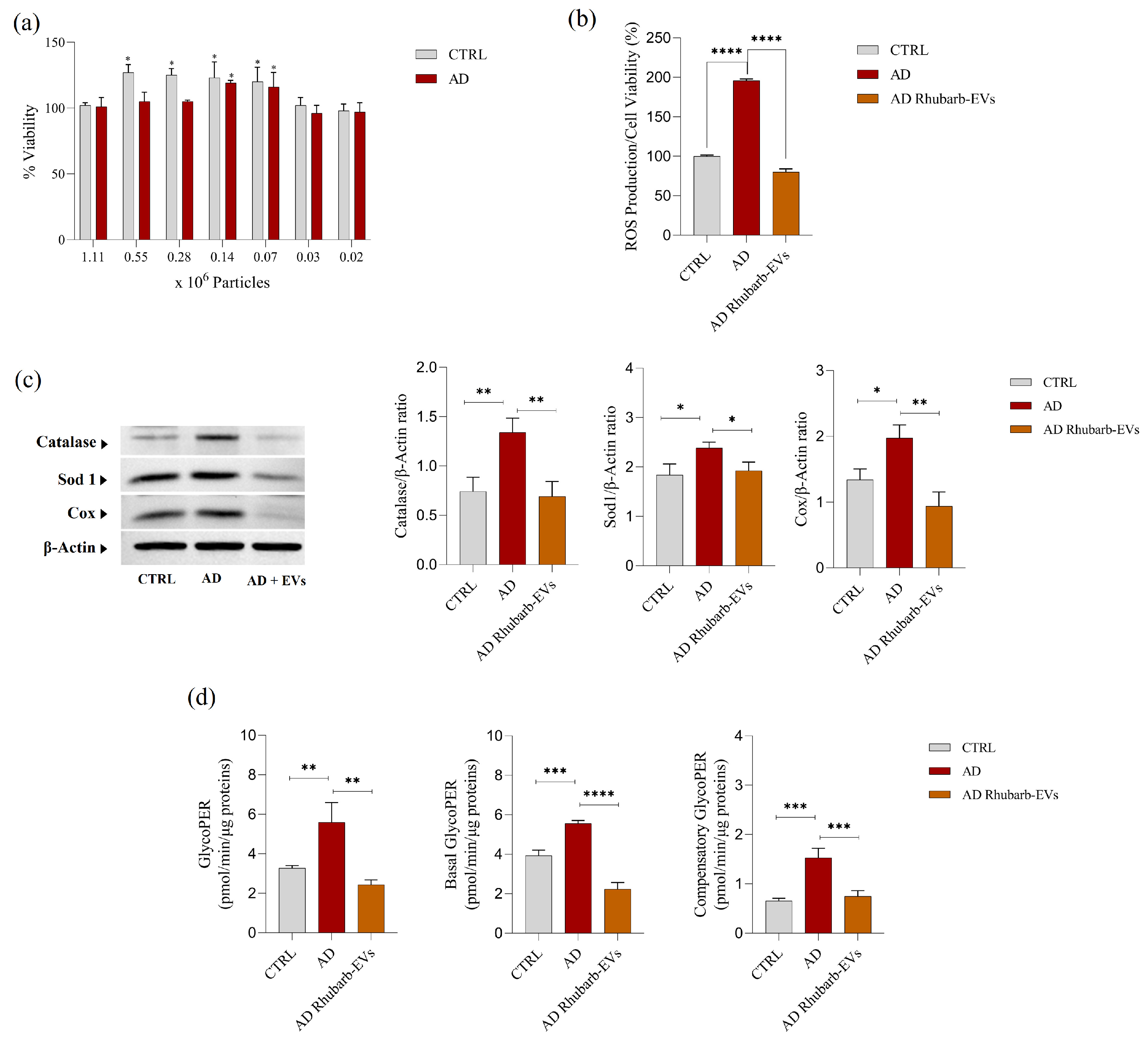 Calzoni, E.; Cusumano, G.; Bertoldi, A.; Alabed, H.B.R.; Pellegrino, R.M.; Buratta, S.; Urbanelli, L.; Zengin, G.; Emiliani, C. Rhubarb-Derived Extracellular Vesicles Mitigate Oxidative Stress and Metabolic Dysfunction in an Alzheimer’s Cellular Model. Nutrients 2025, 17, 3771. https://doi.org/10.3390/nu17233771