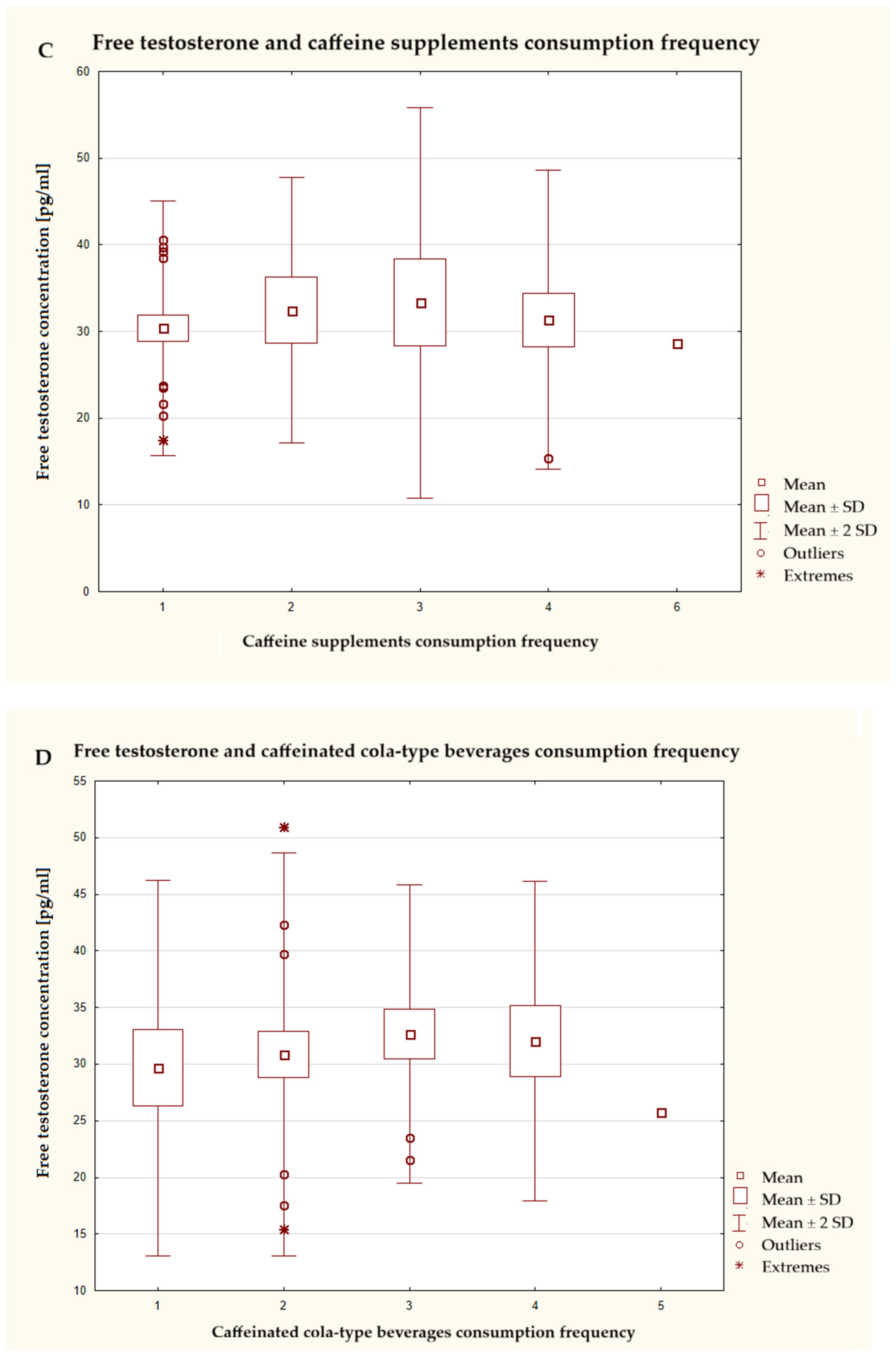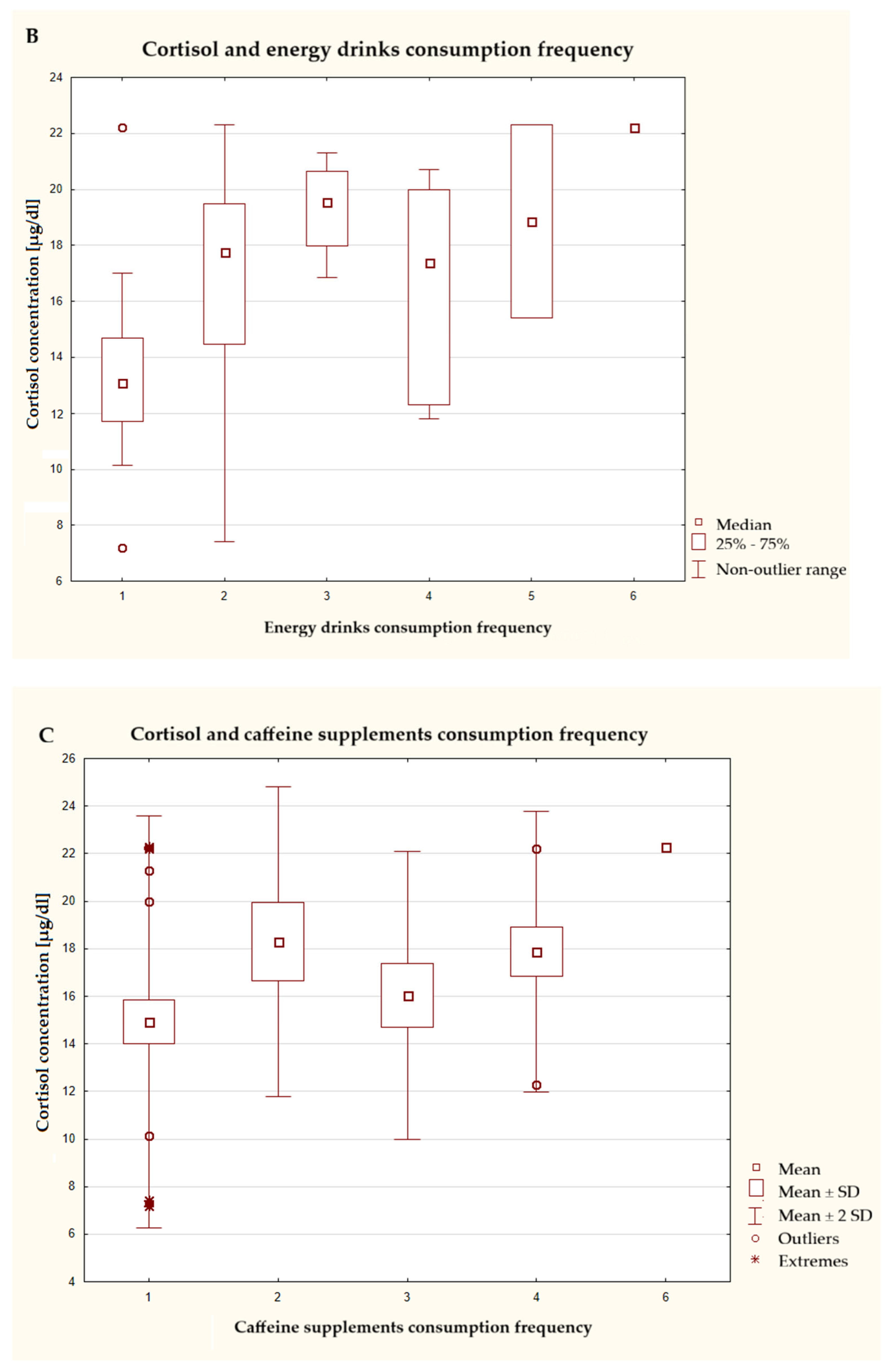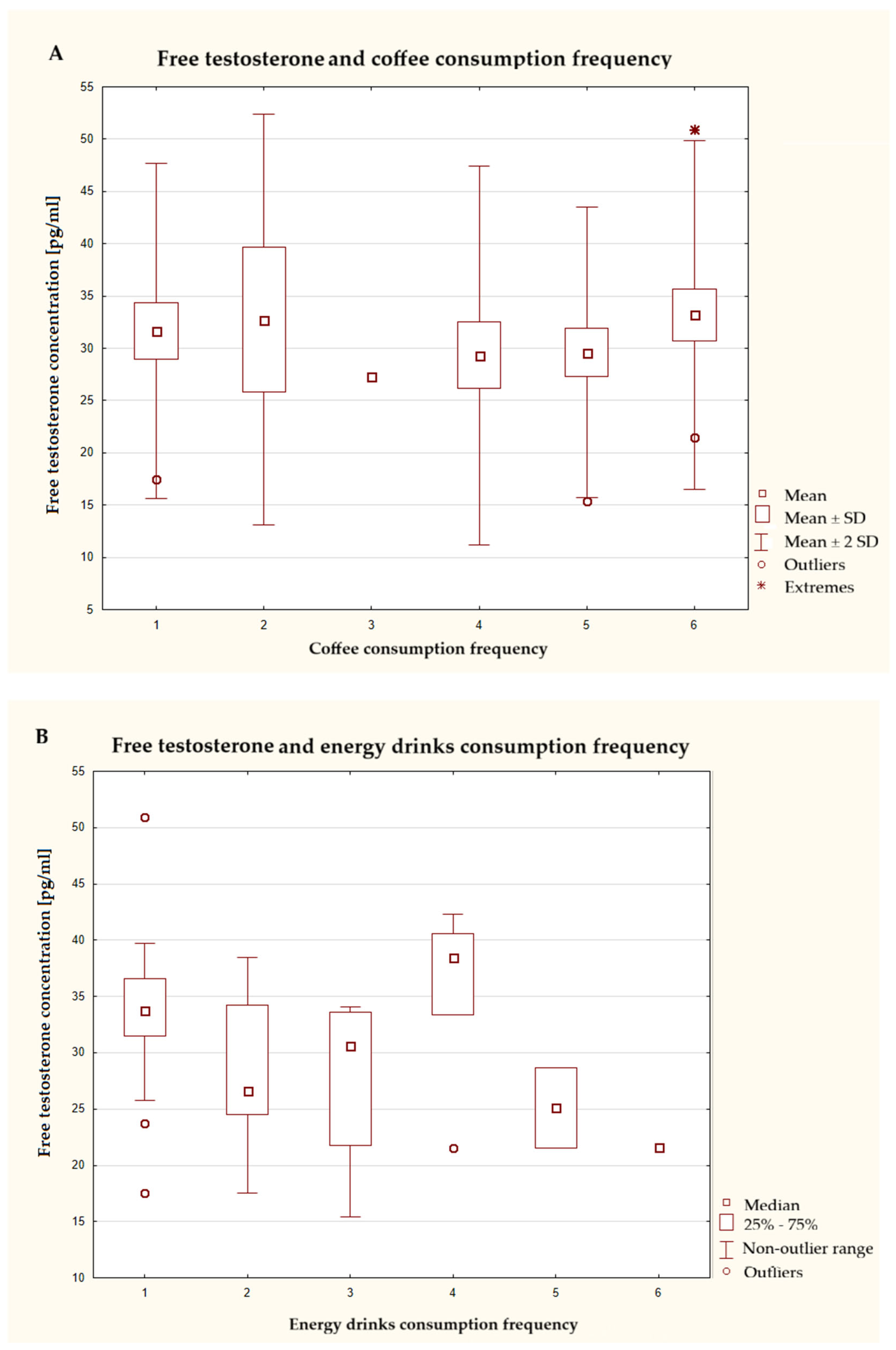Among the stimulants evaluated in our study, the consumption of caffeine in the form of energy drinks and supplements was statistically significant. More frequent use of these products was associated with an increase in the morning cortisol concentration in the blood plasma of men. A study by Gür et al. conducted on a group of footballers showed that caffeine intake has a significant impact on the body’s hormonal response and physical performance. Caffeinated coffee, decaffeinated coffee, pure caffeine in capsule form, and placebo capsules were considered. In the case of cortisol, the increase in cortisol concentration did not differ significantly between the coffee, decaffeinated coffee, and capsule groups, but was the lowest in the placebo capsule group. Caffeinated coffee results in greater exercise efficiency and higher testosterone concentrations [