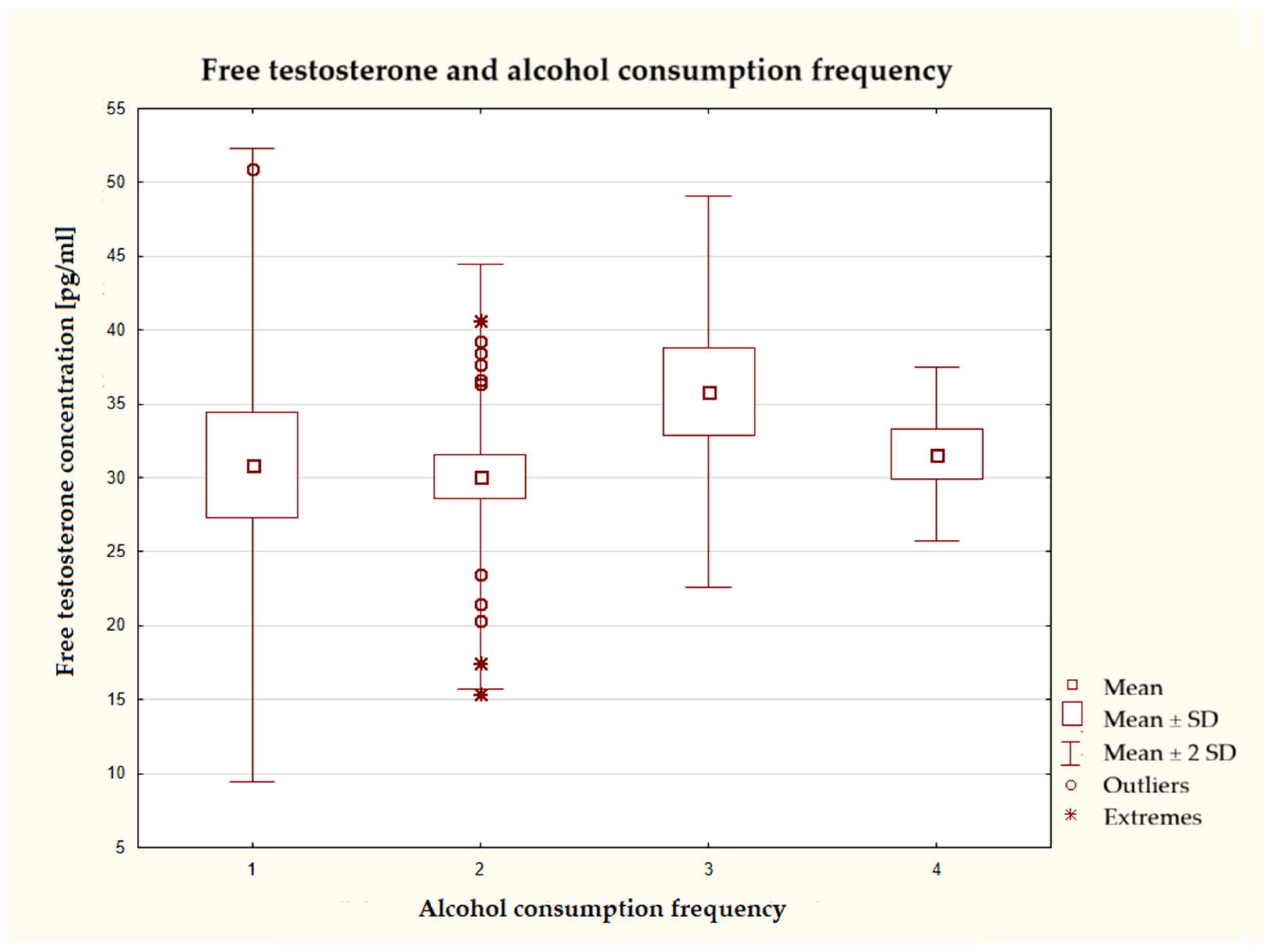 Our study did not show a significant relationship between the frequency of caffeine, alcohol, tobacco, and marijuana use and the concentration of free testosterone in the blood serum. A meta-analysis from 2024 showed that chronic alcohol consumption significantly reduces the concentration of free testosterone in the blood of healthy men. This effect was not observed in patients with alcoholism [