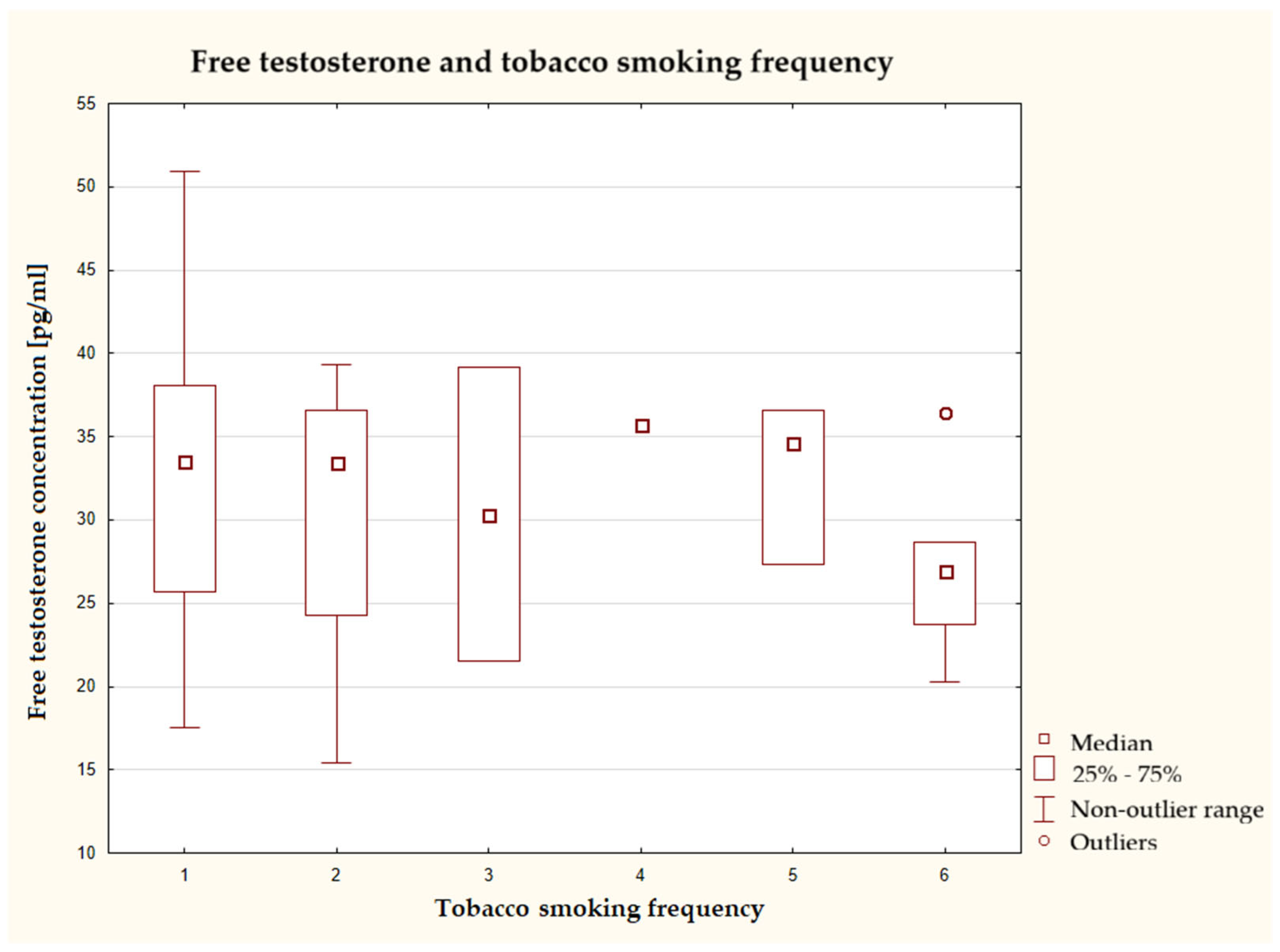 19]. However, it was not possible to recruit a sufficiently large number of obese participants for our study, and as a result, it was not possible to form two groups (with normal and abnormal body weights) whose hormone concentrations could be compared. This is probably why body weight, waist circumference, and BMI showed no correlation with free testosterone concentration [