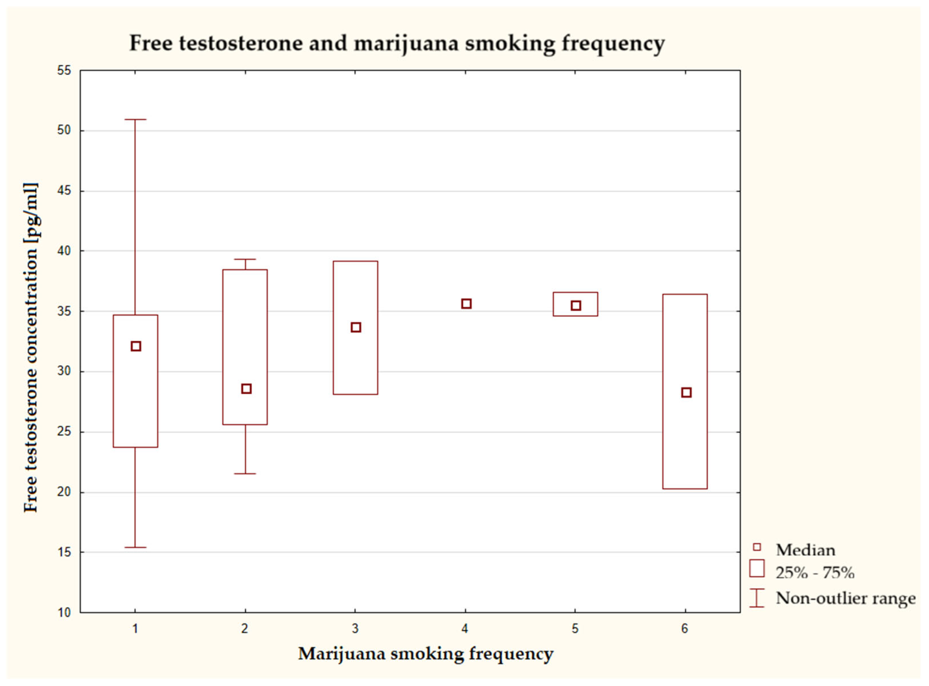 25]. Similar results were obtained in another study, which found that subjects who smoked marijuana more frequently had 8% higher serum testosterone concentrations; however, the authors pointed to a potential link between higher testosterone levels and a greater propensity for risky behavior, such as drug use [
