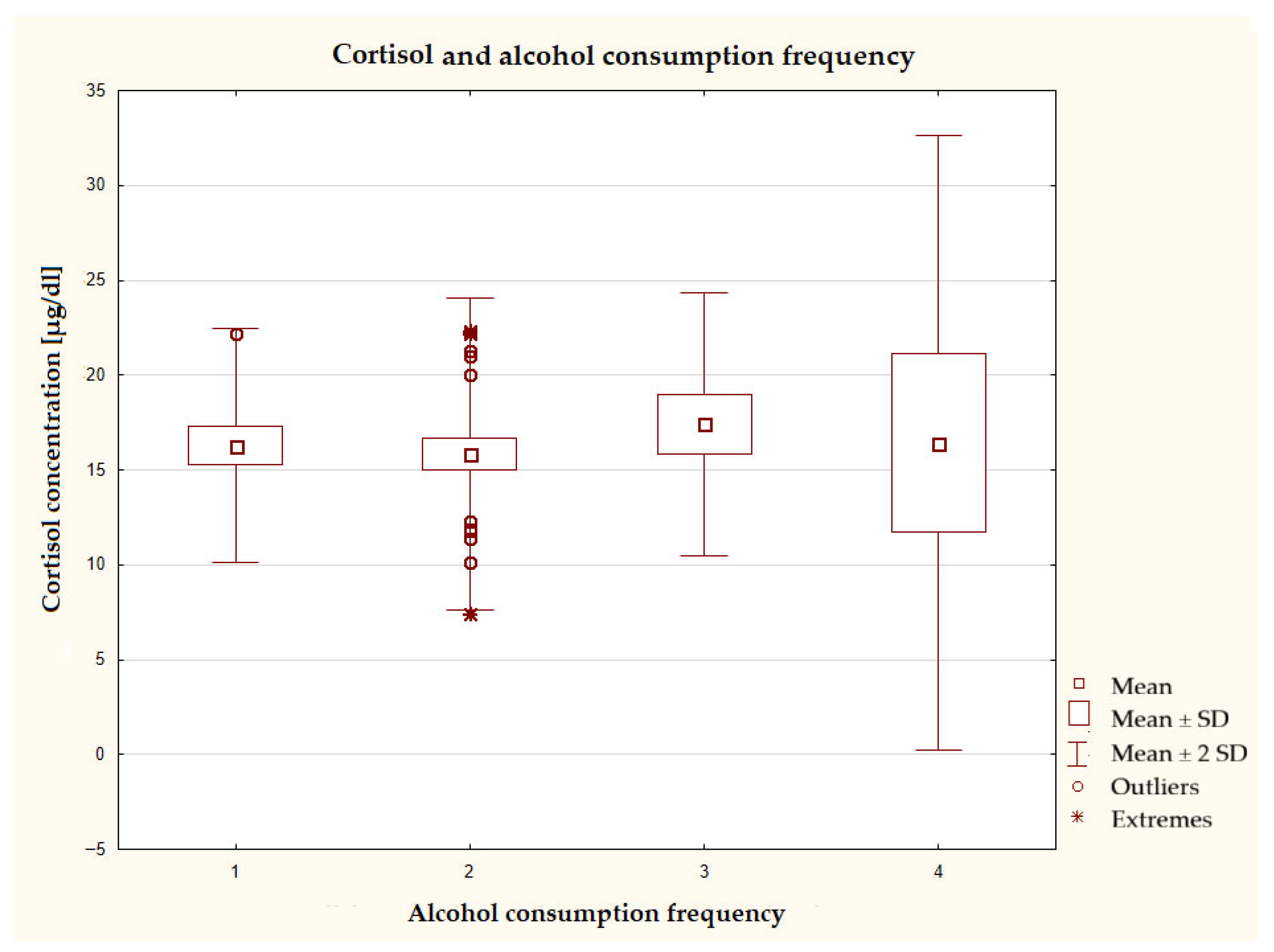 54]. In our study, no statistically significant correlation was found between alcohol consumption and cortisol concentration; the correlation coefficient had positive values, and in the group that consumed alcohol most frequently, cortisol concentrations had the highest values, which may suggest a trend consistent with the aforementioned reports.