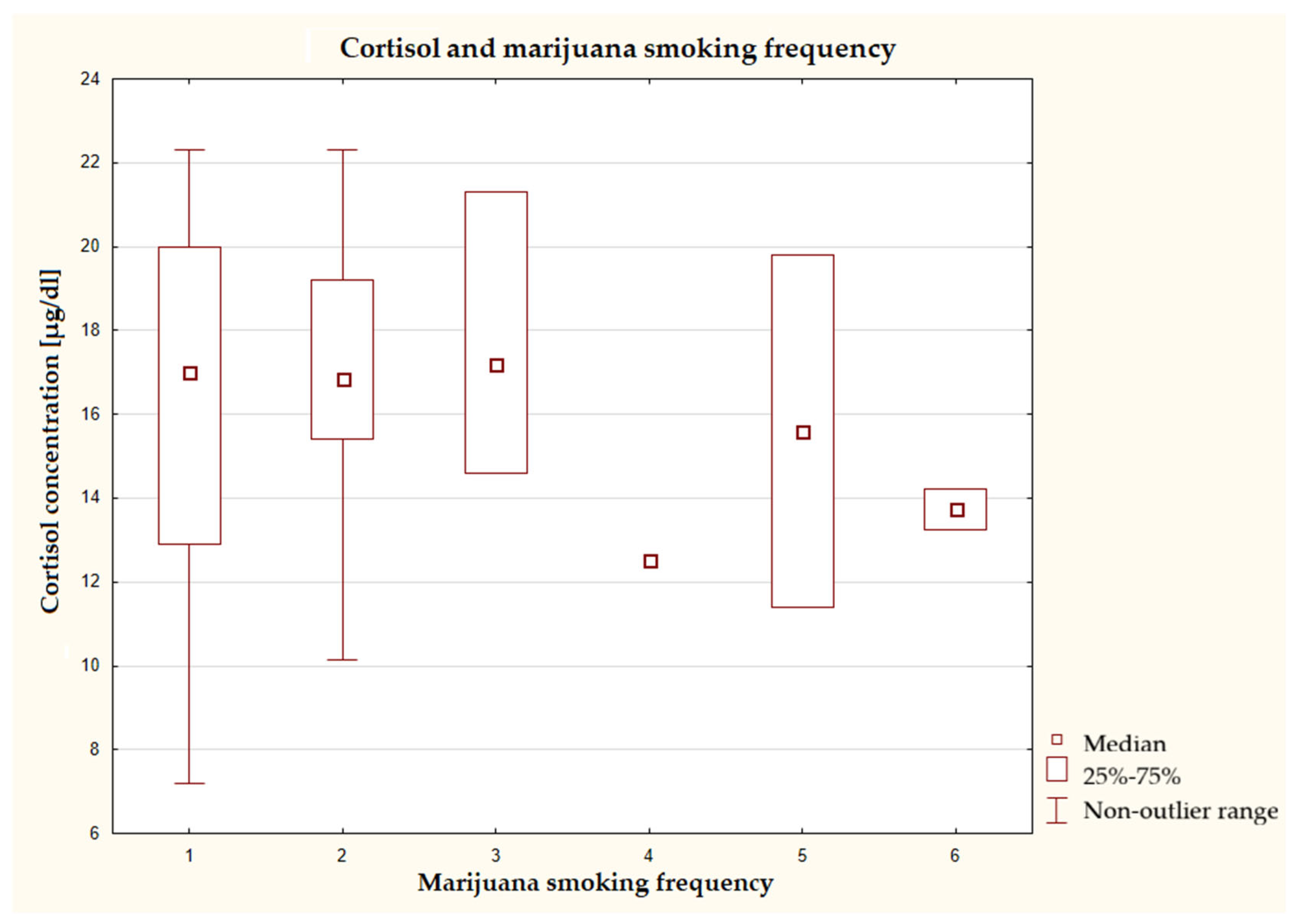 59]. Despite the lack of statistical significance in the results obtained in our study, cortisol levels were relatively low in the group of most frequent marijuana users.