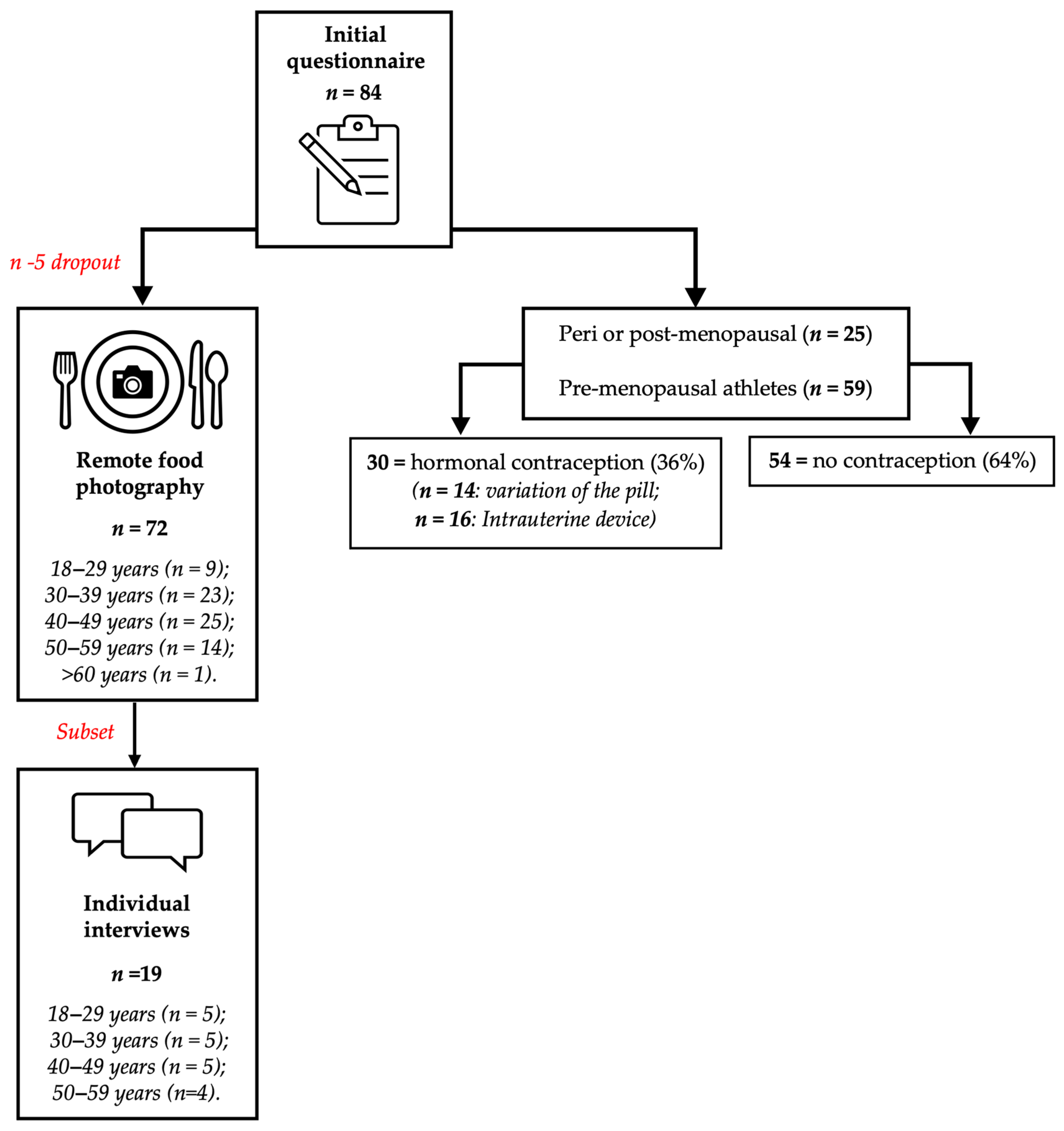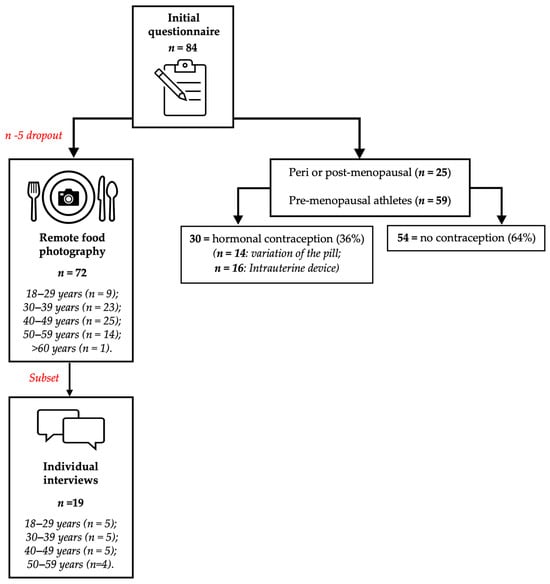 Flow chart of participation process from initial questionnaire responses to remote food photography data collection, to individual interviews. Of the 84 athletes who initially expressed interest, 72 completed the quantitative component. Nineteen participants were subsequently interviewed as a subset sample for interviews and qualitative analysis. Red text demonstrates the particpaton during different phases of the study.