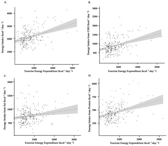 Relationships across the 4-day monitoring period between EEE and energy intake (A), energy intake from CHO (B), energy intake from fat (C), and energy intake from protein (D), all expressed to kcal·day−1. Individual dots represent individual data points for each day of food tracking. The grey line signifies the line of best fit from a simple linear regression model, and the shaded grey represents SD.