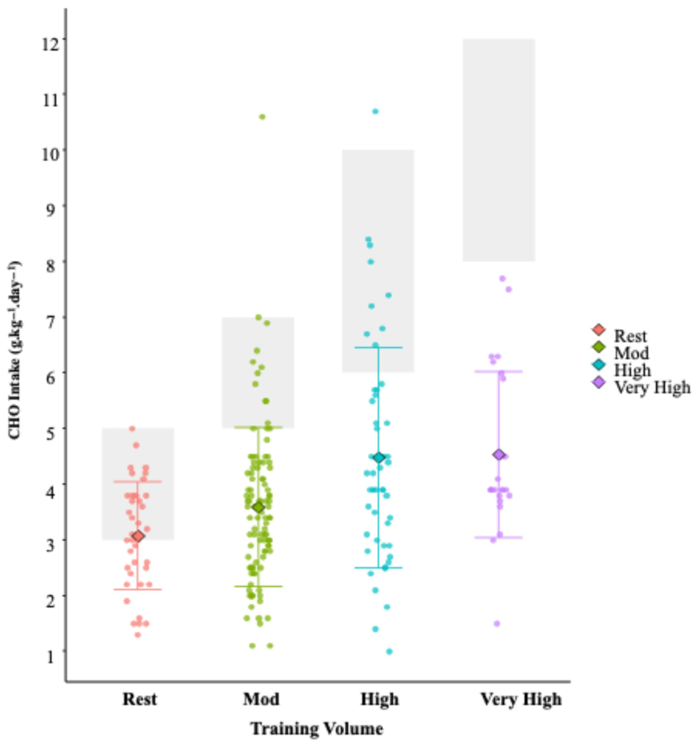 Relative CHO intake of the cohort of female endurance athletes, stratified by daily training volume (Rest: <45 min training; Mod (moderate): 45–90 min training; High 90–210 min training; V. High (Very High): >210 min training). Shaded grey boxes denote CHO intake recommendations that correspond to the daily training load, according to the guidelines of Thomas et al. [16]. Individual dots represent daily values; central diamonds indicate averages, and error bars show standard deviations.