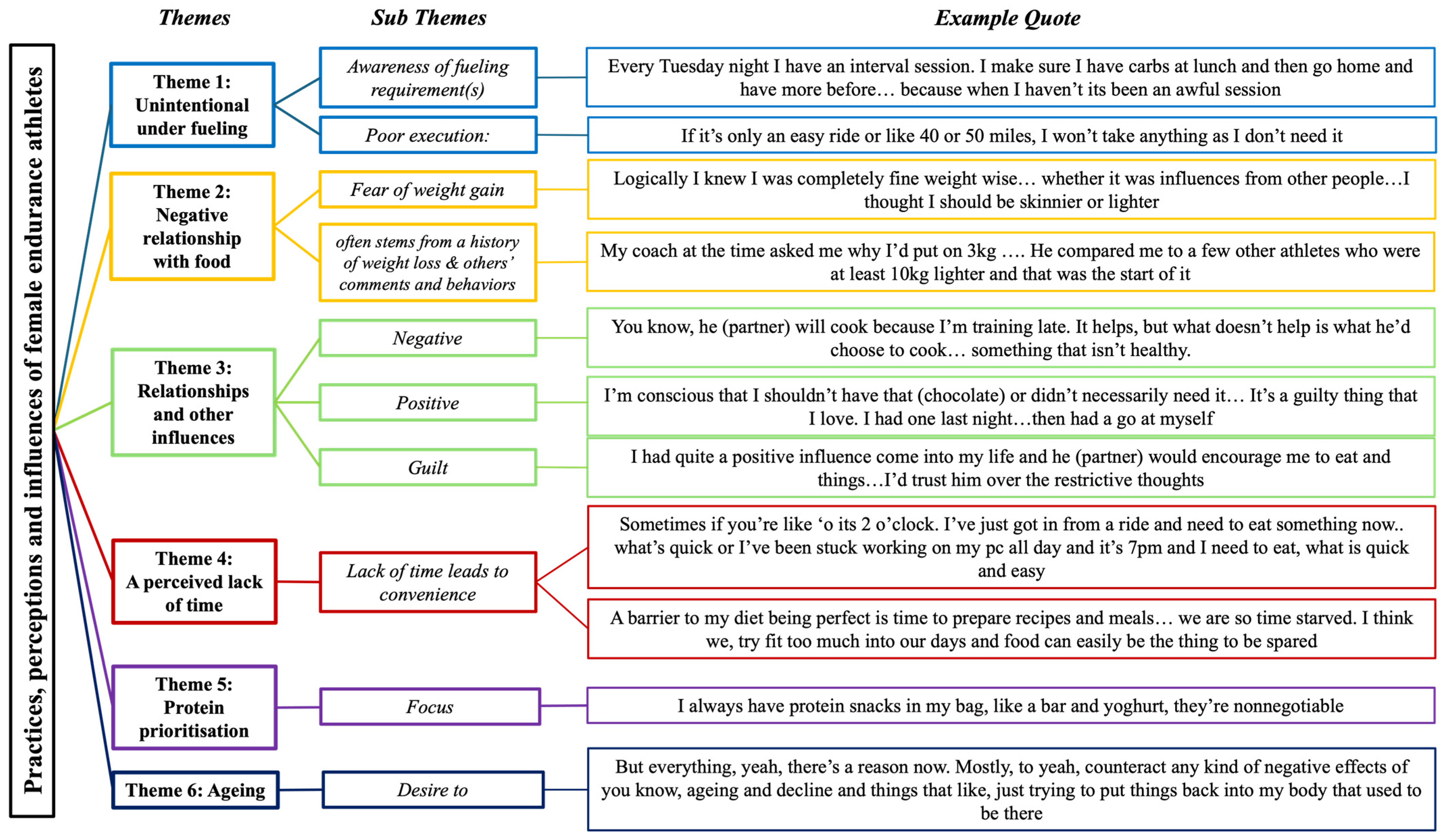 To further enhance transparency, participant characteristics contributing to each qualitative theme are summarised in Table 6. This table outlines the distribution of participants by age range and training volume, across the six themes. Several participants contributed to more than one theme, reflecting the interconnected and multifactorial nature of nutrition-related experiences among female endurance athletes.