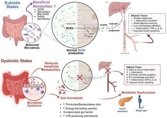 The gut microbiota–adipose tissue axis under eubiotic and dysbiotic conditions. Eubiosis: A balanced gut microbiota promotes the production of beneficial metabolites such as short-chain fatty acids (SCFAs), secondary bile acids, and indole derivatives, supporting adipose tissue homeostasis and insulin sensitivity. Dysbiosis: Imbalanced microbiota reduces beneficial metabolites, compromises gut barrier integrity (indicated by broken barrier), increases lipopolysaccharide (LPS) translocation (red arrows), and induces adipose inflammation, leading to metabolic dysfunction. Created by the authors using BioRender.com (accessed on 20 October 2025).
