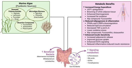 Marine algae as postbiotic sources and their metabolic benefits. Seaweed polysaccharides (alginate, laminarin, fucoidan, ulvan) and microalgae biomasses (Spirulina, Chlorella) act as postbiotic substrates that enrich beneficial bacteria (Akkermansia, Lactobacillus, Bifidobacterium) and enhance SCFA signaling. Bioactive compounds such as fucoxanthin, astaxanthin, and phycocyanin promote energy expenditure, reduce adipogenesis and inflammation, and improve insulin sensitivity. Created by the authors using BioRender.com (accessed on 20 October 2025).