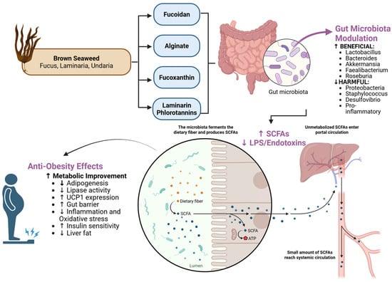Brown seaweed-derived compounds and their microbiota-mediated anti-obesity mechanisms. Top: Major bioactive compounds from brown algae (fucoidan, alginate, laminarin, phlorotannins). Middle: Effects on gut microbiota showing increased beneficial taxa (Lactobacillus, Bacteroides, Akkermansia) and decreased harmful taxa (Proteobacteria, Staphylococcus). Bottom: Downstream metabolic effects, including increased SCFA production (acetate, propionate, butyrate) and decreased LPS/endotoxin levels. The resulting improvements in gut barrier function, reduced inflammation, and enhanced adipose metabolism contribute to overall metabolic health. Created by the authors using BioRender.com (accessed on 20 October 2025).