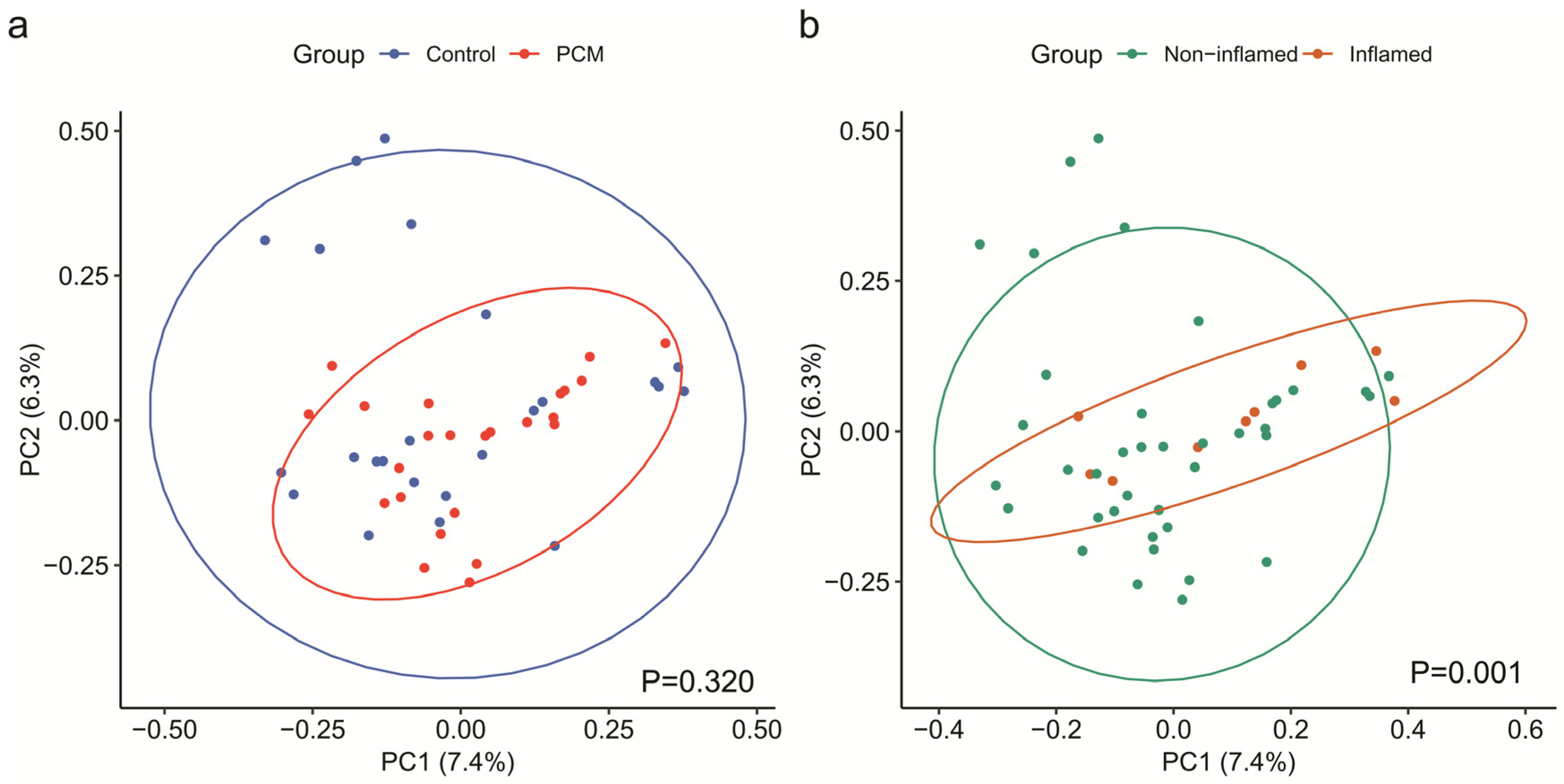 3.1. Microbial Diversity and Overall Composition of the Colonic Mucosal Microbiota Were Not Significantly Altered in IBD Patients with PCM Compared to Those Without PCM