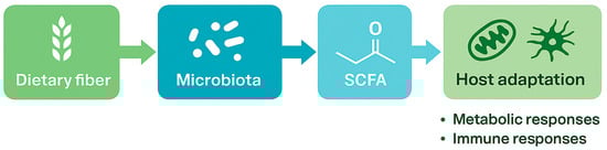Short-chain fatty acids (SCFAs) are not merely fermentation by-products of the gut microbiota but key signaling metabolites influencing host physiology across multiple biological levels [1,3]. These molecules function as carbon donors, allosteric regulators, and epigenetic modulators, effectively translating dietary fiber fermentation into systemic metabolic and immunological adaptation [4,5]. Beyond these canonical roles, SCFAs also participate in metabolite–receptor crosstalk involving enteroendocrine peptides, vagal afferent signaling, and nutrient-sensing pathways, further integrating gut-derived metabolic inputs into whole-body energy homeostasis and stress resilience.