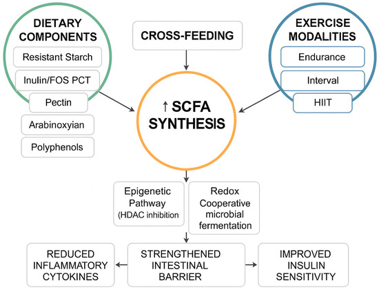 An emerging paradigm within this framework is the recognition that physical activity serves as a central modulator of microbial diversity, substrate flux, and metabolite production. Endurance and high-intensity training modify gut perfusion, bile acid profiles, and lactate dynamics, thereby influencing microbial activity and host resilience [6,8]. Recent evidence also highlights interactions between gut microbiota composition, protein absorption, and athletic performance [9], underscoring the bidirectional relationship between exercise physiology and microbial metabolic output.