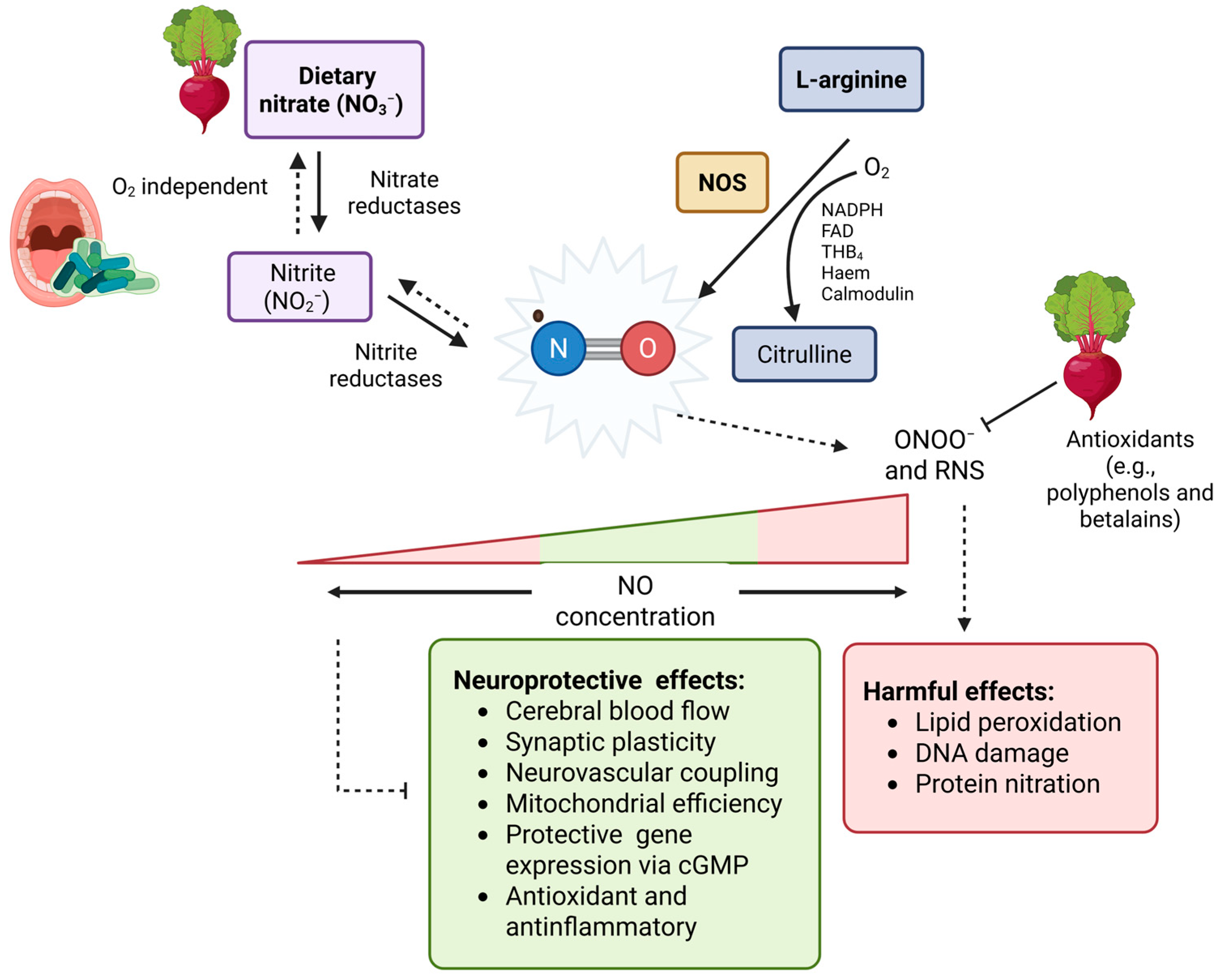 Figure 2. Nitric oxide (NO) is generated by nitric oxide synthases (NOS), which convert L-arginine and oxygen in the presence of essential cofactors [e.g., NADPH, flavin adenine dinucleotide (FAD), tetrahydrobiopterin (BH4), haem, and calmodulin], producing L-citrulline as a by-product. Alternatively, dietary nitrate, found in leafy greens and beetroot, can contribute to NO formation through its reduction to nitrite (NO2) by oral bacteria (a rapid pathway) and xanthine oxidase (a slower pathway), which can be converted to NO via acidic reduction in the stomach or via various systemic nitrite reductases. This pathway is reversible hence the dashed arrows. The concentration of NO is relevant to its effects; while NO may be neuroprotective, high concentrations could contribute to oxidative and nitrosative stress when dysregulated. Although beetroots antioxidants may counteract this as discussed later.