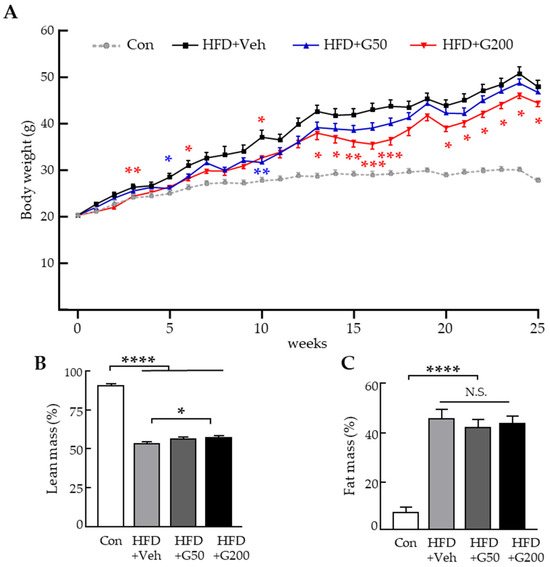 The administration of KRGM-gintonin reduces body weight and increases lean mass in high-fat diet (HFD)-fed mice. (A) Body weight was measured weekly during 25 weeks of KRGM-gintonin treatment. (B) Lean mass and (C) fat mass were assessed at week 24 using Echo-MRI. Data are expressed as mean ± S.E.M. (n = 10–11). Statistical significance between control (Con), HFD+Veh, HFD+G50 (KRGM-gintonin, 50 mg/kg), and HFD+G200 (KRGM-gintonin, 200 mg/kg) were determined using one-way ANOVA followed by Tukey’s post hoc test: * p < 0.05, ** p < 0.01, *** p < 0.001, **** p < 0.0001. N.S., not significant. Asterisks in different colors denote statistically significant differences between the respective treatment groups indicated by matching colors (e.g., red asterisks for group HFD+G200 blue asterisks for group HFD+G50).