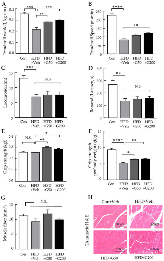 Effects of KRGM-gintonin on exercise performance and muscle function in HFD-fed mice. Mice were subjected to a treadmill running test with a 5° incline and increasing speed until exhaustion. (A) Total treadmill work performed and (B) maximum speed achieved. (C) Locomotor activity assessed by the open field test showed no significant change following KRGM-gintonin treatment. (D) Motor coordination and learning evaluated by the accelerating rotarod test were also unaffected by treatment. (E) Effect of KRGM-gintonin on normalized forelimb grip strength and (F) grip strength adjusted for body weight. (G) Quantification of tibialis anterior (TA) muscle analyzed by Image J v1.54r software. (H) Representative H&E staining of skeletal muscle (Scale bar: 200 μm, magnification: 10×). Data are expressed as mean ± S.E.M. (n = 4). Statistical differences between Con, HFD+Veh, HFD+G50, and HFD+G200 were determined using one-way ANOVA followed by Tukey’s post hoc test: * p < 0.05, ** p < 0.01 *** p < 0.001, **** p < 0.0001, N.S.: not significant.