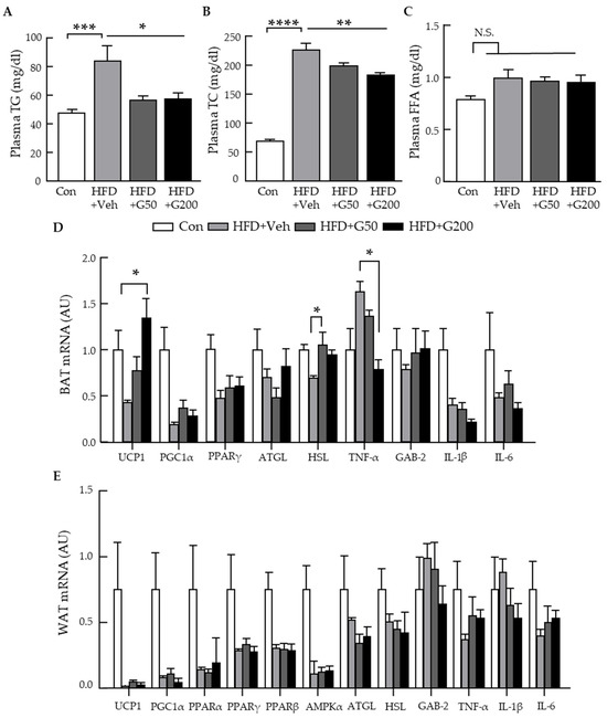 Oral administration of KRGM-gintonin improves the serum lipid profile and modulates thermogenic, lipolytic and inflammatory gene expression in brown adipose tissue (BAT) of HFD-fed mice. (A) Serum total triglycerides (TG), (B) total cholesterol (TC), and (C) free fatty acid (FFA) levels measured at the end of the study. (D) BAT and (E) white adipose tissue (WAT) samples (n = 4–6 per group) were collected for quantitative PCR analysis of thermogenesis-related gene expression. Statistical differences between Con, HFD+Veh, HFD+G50, and HFD+G200 were determined using one-way ANOVA followed by Tukey’s post hoc test: * p < 0.05, ** p < 0.01, *** p < 0.001, **** p < 0.0001, N.S., not significant.