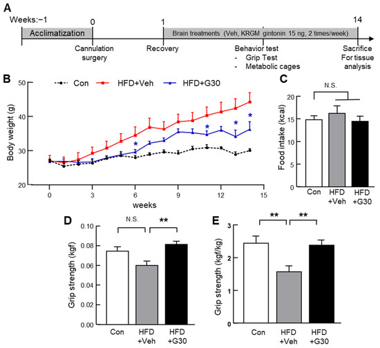 Intracerebroventricular (ICV) injection of KRGM-gintonin reduces body weight and improves muscle strength in HFD-fed mice. (A) Schematic timeline of the 14-week experimental protocol. (B) Body weight measured weekly throughout the study. (C) Daily food intake recorded over a 24 h period. (D,E) Effect of KRGM-gintonin on normalized forelimb grip strength and grip strength adjusted for body weight, assessed at week 12. Data are expressed as mean ± S.E.M. (n = 6–7). Statistical differences between Con, HFD+Veh (PBS injection), and HFD+G30 (KRGM-gintonin, 30 ng/0.5 μL)) were determined using one-way ANOVA followed by Tukey’s post hoc test: ** p < 0.01, N.S., not significant. Asterisks in different colors denote statistically significant differences between the corresponding treatment groups, with each color matching the group it represents.