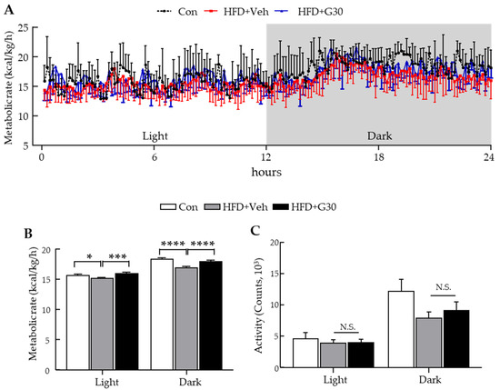 ICV administration of KRGM-gintonin improves energy expenditure and metabolic profile in HFD-fed mice. (A) 24 h metabolic rate (kcal/kg/h) calculated from oxygen consumption and carbon dioxide production. (B) Average metabolic rate during the experimental period. (C) Locomotor activity counts recorded throughout the study. Data are expressed as mean ± S.E.M. (n = 6–7). Statistical differences between Con, HFD+Veh and HFD+G30 were determined using one-way ANOVA followed by Tukey’s post hoc test: * p < 0.05, *** p < 0.001, **** p < 0.0001, N.S., not significant.
