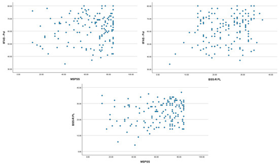 The sociodemographic and obstetric characteristics of the study population are presented in Table 1. Women aged ≥35 years reported high levels of birth satisfaction and generally positive attitudes toward breastfeeding. Exclusive breastfeeding was the most common feeding method in both groups, with slightly higher prevalence among multiparous women (68.7%, n = 46) compared with primiparous women (61.7%, n = 50). Positive breastfeeding experiences were also more frequently reported by multiparas (71.6%, n = 48) than by primiparas (53.1%, n = 43), as shown in Table 1. Correlation analyses revealed clear parity-related differences. Among multiparous women, birth satisfaction showed a moderate positive association with breastfeeding attitudes (BSS-R PL; r = 0.396, p < 0.01), and perceived social support demonstrated a small but statistically significant association (MSPSS; r = 0.249, p < 0.05). Birth satisfaction was also correlated with social support in this group. These associations are presented in Table 2 and visualized in Figure 1. In primiparous women, none of the correlations between breastfeeding attitudes, birth satisfaction, or perceived social support reached statistical significance.