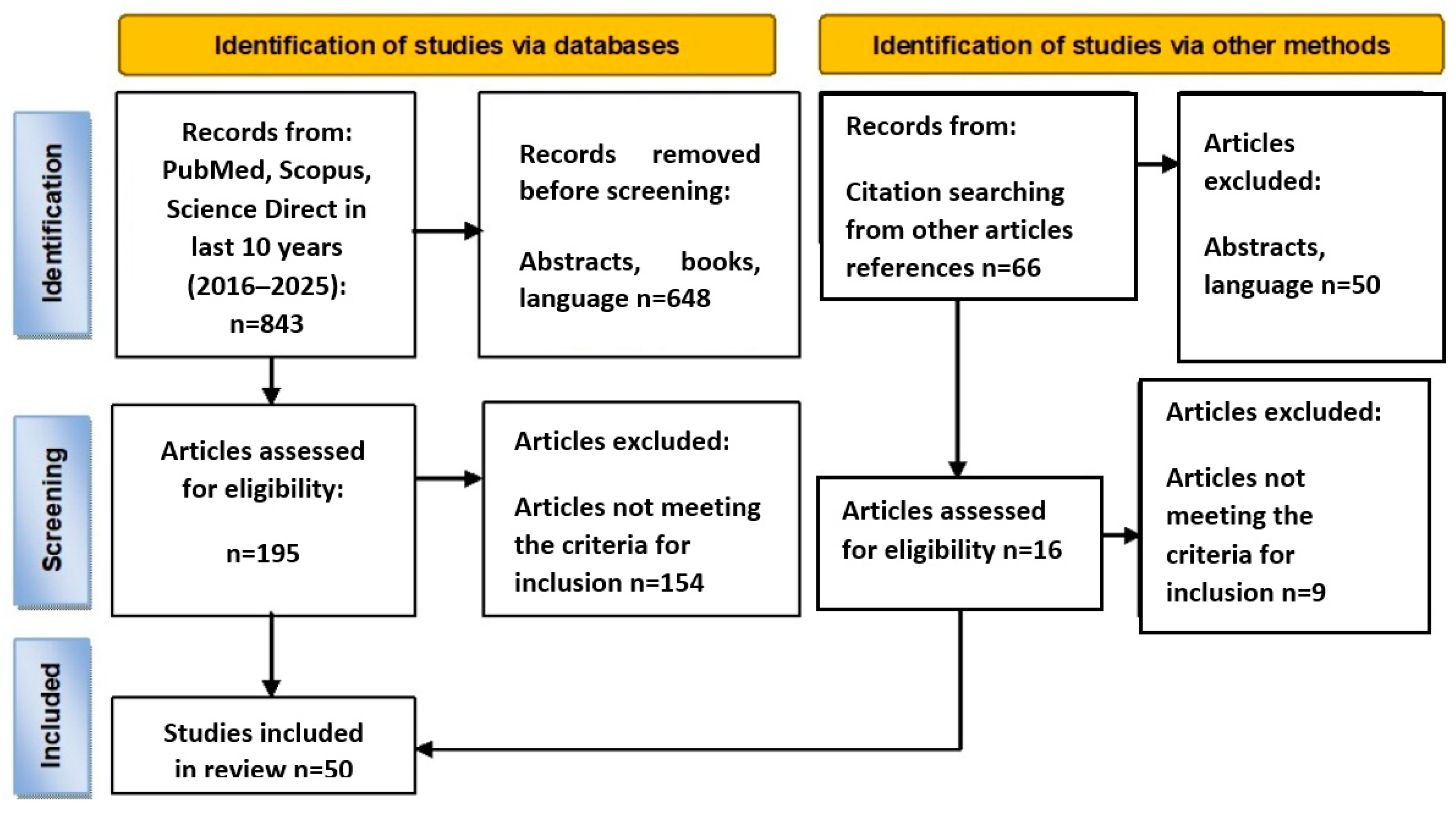 Our search resulted in 843 total references, and 50 papers were within our scope of interest. The selection process is illustrated using the PRISMA 2020 flow diagram [