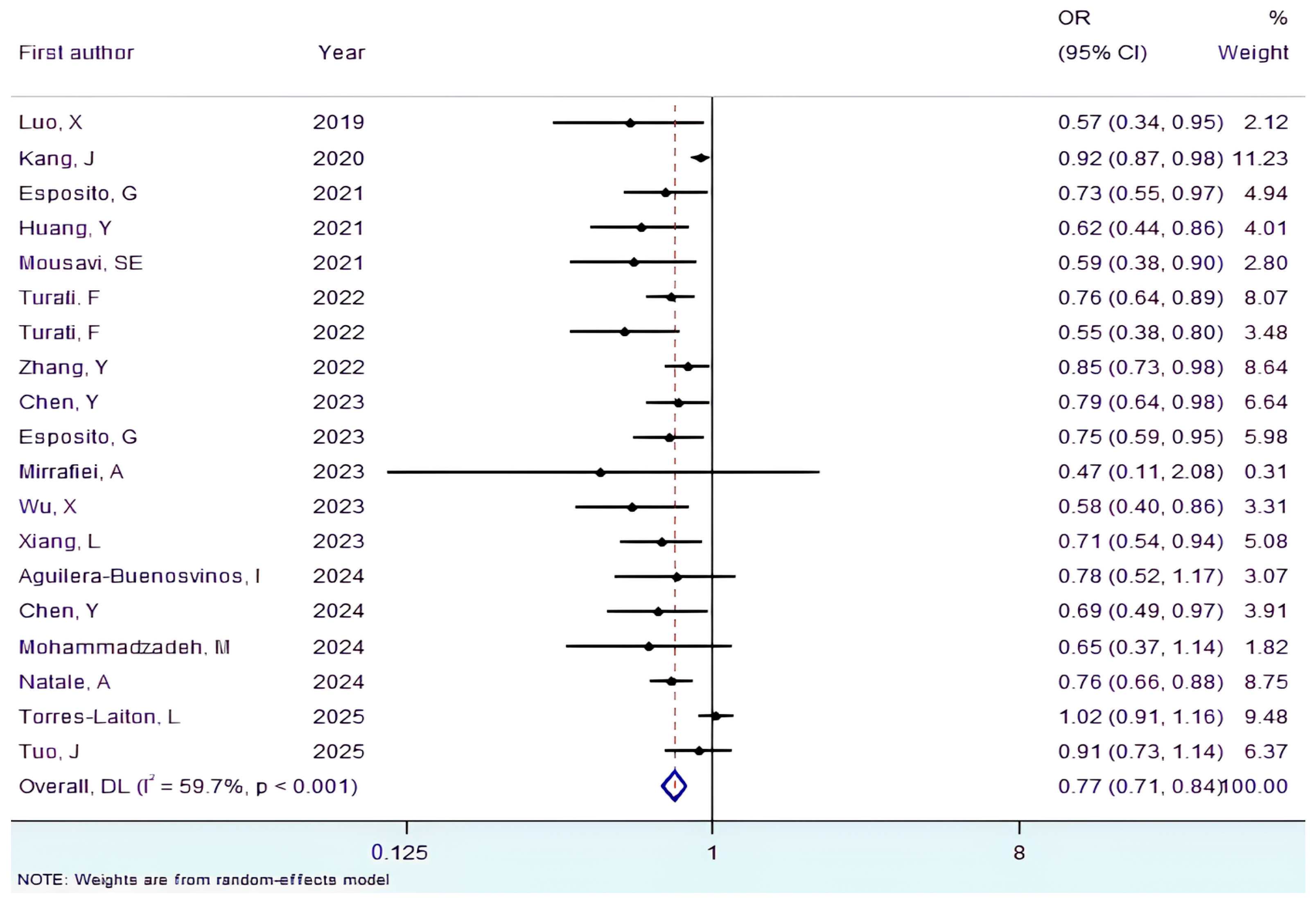 | Overall analysis | 19 | 0.77 (0.71–0.84) | <0.001 | 59.7% | <0.001 | |