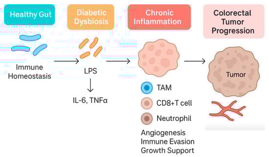 Thus, dysbiosis not only fuels inflammation but also skews immune responses toward tumor tolerance. In diabetic states, systemic inflammation and altered gut microbes may further impair anti-tumor immune vigilance, for example, by increasing the number of myeloid-derived suppressor cells or inflammatory macrophages in circulation. The combined effect is a breakdown of normal immune-mediated tumor suppression.