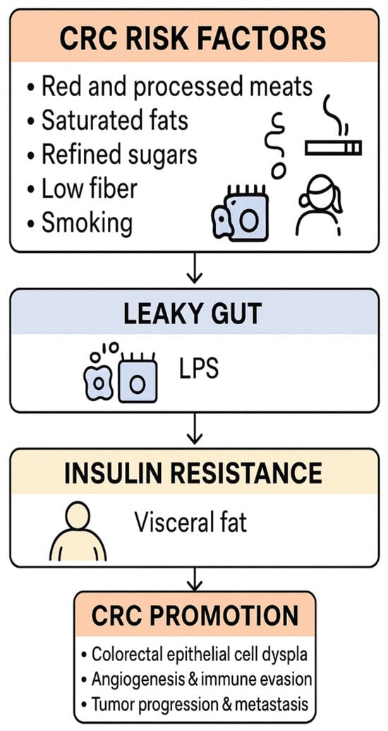 Chronic low-grade inflammation is a well-established link between metabolic syndrome and cancer, and the gut microbiome plays a significant role in this immune dysregulation [73]. Both T2DM and CRC are associated with a “leaky gut” phenomenon, wherein dysbiosis compromises the intestinal barrier, allowing microbial products, such as lipopolysaccharide (LPS), to translocate into the circulation. In metabolic disease, this microbial endotoxemia triggers systemic inflammation via Toll-like receptor 4 (TLR4) and NF-κB signaling, contributing to insulin resistance and tissue damage [8]. For instance, obese diabetic mice exhibit elevated serum LPS, which correlates with inflammation in both hepatic and adipose tissue, while treatments that modulate microbiota reduce LPS and restore barrier function (e.g., prebiotics enhancing tight-junction proteins) [74,75].