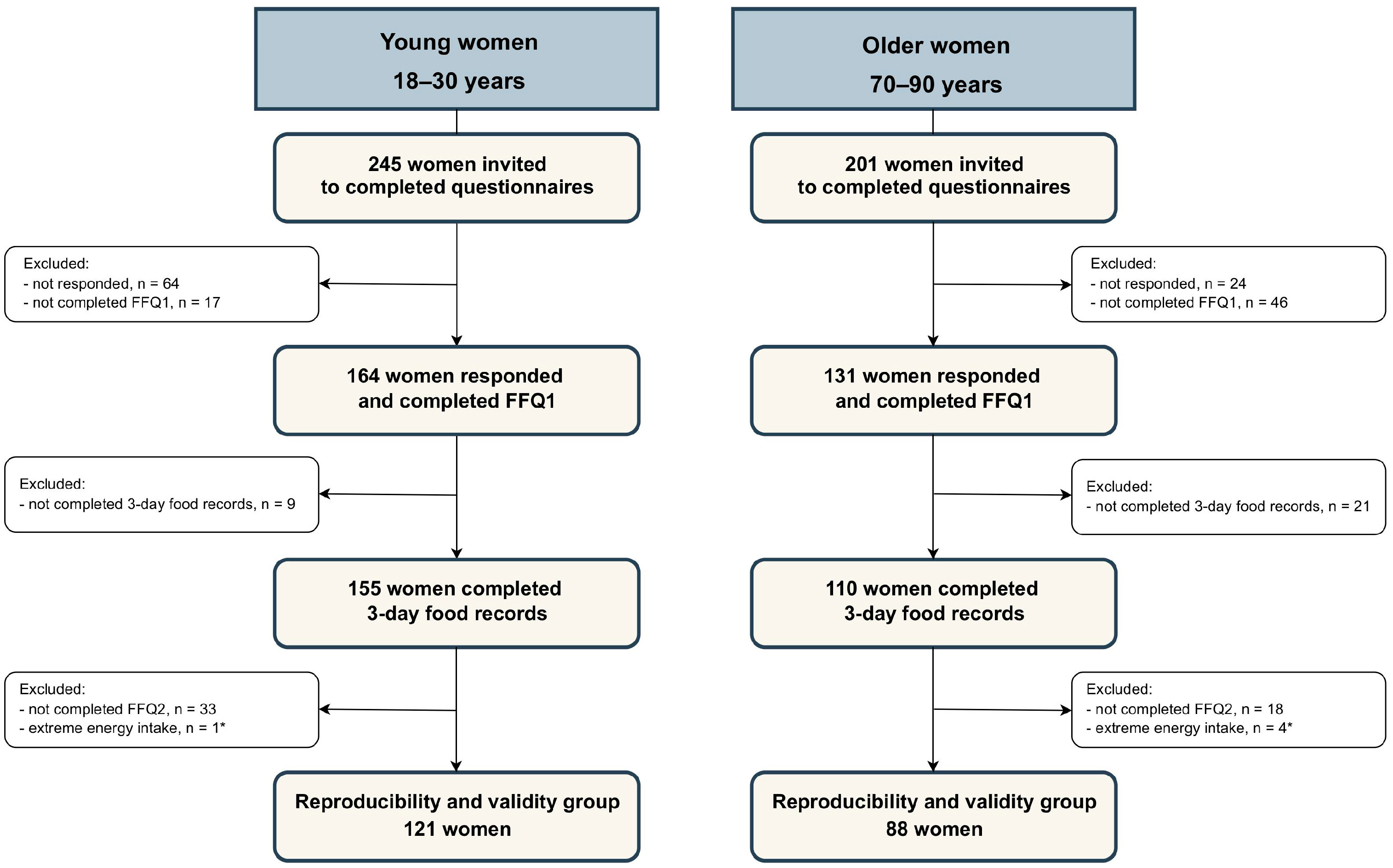 Chicago/Turabian StyleSzmidt, Maria Karolina, Ewa Sicinska, Olga Januszko, and Joanna Kaluza. 2025. "FFQ-NutriForHer: Reproducibility and Validity of a Semi-Quantitative Food Frequency Questionnaire for Young and Older Women" Nutrients 17, no. 24: 3811. https://doi.org/10.3390/nu17243811