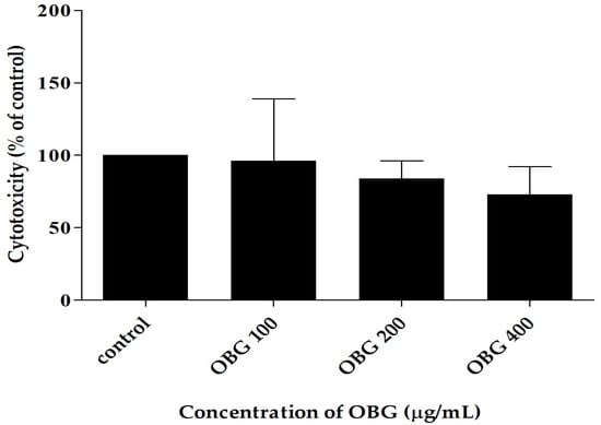 The cytotoxicity of OBG was assessed by flow cytometry based on the fluorescence intensity of SYTOX™ Blue Dead Cell Stain (ThermoFisher Scientific, Waltham, MA, USA, S34857); the nucleic acids of dead cells fluoresce bright blue when excited with 405 nm violet laser light. Caco-2, HT29-MTX, and cells differentiated with PMA (Phorbol 12-myristate 13-acetate, Sigma-Aldrich), THP-1 cells, were seeded into 24-well 3D plate Corning® HTS Transwell® (Sigma Aldrich, St. Louis, MO, USA)-24 well permeable supports and grown overnight to reach 1.5 × 105 cells/well on average (in a ratio 70%:30% Caco-2: HT29-MTX). The cells were incubated with OBG (100, 200 and 400 µg/mL) for 24 h. Subsequently, the cells were detached by trypsinization and spun down (200× g, 5 min); 1 µM of Sytox Blue was added and incubated for 5 min. The cells were washed once with the culture medium containing 10% FBS, resuspended in the culture medium containing 2% FBS, and analyzed by flow cytometry. Fluorescence was analyzed with a 440/40 nm filter using flow cytometry (LSRFortessa, BD Biosciences, Franklin Lakes, NJ, USA) (Supplementary Data, Table S3).