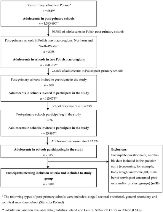 Taking into account the inclusion and exclusion criteria adopted for the study, a group of 3102 students from 26 post-primary schools in two northern Polish macroregions was selected for the study.