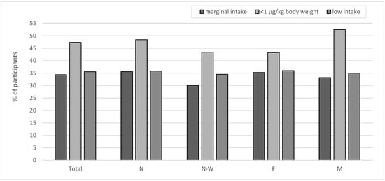 Percentage of adolescents with iodine intake: marginal (<50 µg/day), below 1 µg per kg body weight of participants and low (50–100 µg/day); N—Northern macroregion, N-W—North-Western macroregion, F—female, M—male.